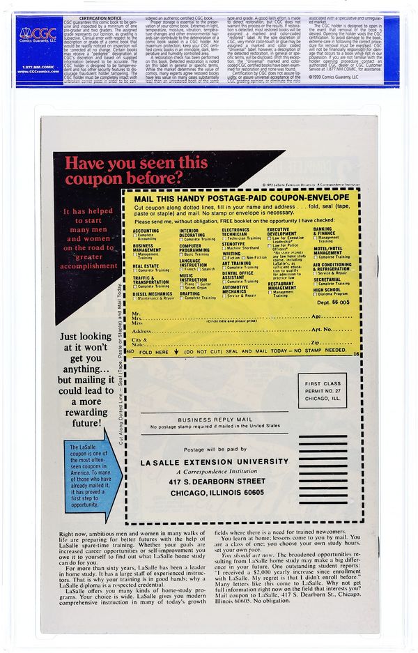 Cover pencils by Ron Wilson, inks by Frank Giacoia. All reprints: The Thing in the Locked Room! (from Tales of Suspense 29) script by Larry Lieber (script, plot) and Stan Lee (plot), pencils by Don Heck; Prince Zemu takes a strange painting as part of his booty, only to discover it saps his life and youth from him. Mystery in Midville (from Uncanny Tales 54), art by John Forte; A petty thief comes across a city where every person is considerate and helpful. Once a Werewolf (from Astonishing 33), art by Sid Greene; A werewolf falls in love with a human girl and resolves to leave the pack. Good-Bye Forever (from Adventures into Mystery 3), art by Joe Maneely; Scientist Hugo Valgon discovers another dimension where greed and aggression are unknown until he inadvertently introduces those attributes. Captain Marvel Hostess Twinkies ad, pencils by Ross Andru, inks by Mike Esposito. 36 pgs., full color. $0.25. Cover price $0.25. Grade: CGC 9.4 explanation of grade Condition: Used (collectible)