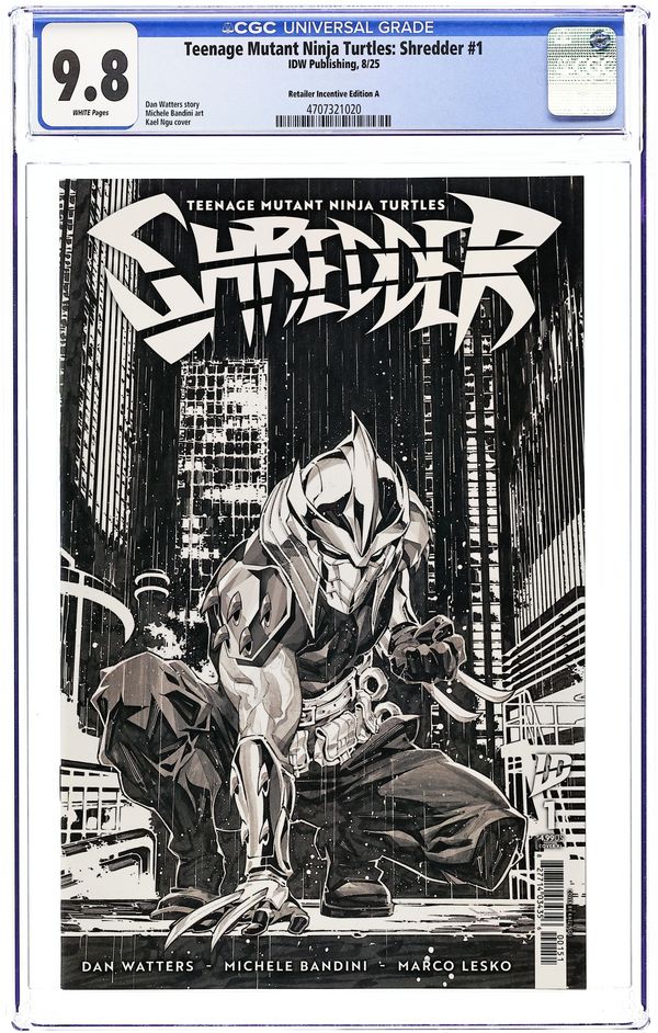 Limited 1 for 25 Retailer Incentive Variant Cover. Written by Dan Watters. Art by Michele Bandini. Cover by Kael Ngu. As a dark new power rises from the shadows of New York, so does a much darker power return to the citys streets…for revenge. One of the most terrifying villains in the history of comics is back—and more deadly than ever!Returned forever changed by a maddening ordeal beyond imagining, the Shredder is a man out of time, betrayed by all around him, without the Foot Clan, and quite possibly insane. When one of his former Foot prodigies forms their own rival clan with infernal designs on New York, a recovering Shredder must quest deep into the criminal underworld, where enemies both old and new will discover what defiance will bring them at the end of the Shredders blades.Dan Watters, the celebrated writer of Batman: Dark Patterns, Nightwing, Lucifer, Six Fingers, and Home Sick Pilots, teams with Michele Bandini (Batman Incorporated, Spider-Man: City at War) to tell the rags-to-revenge story of the ultimate ronin. 32 pages, full color. Cover price $4.99. Grade: CGC 9.8 explanation of grade Condition: Used (collectible) unless item is a new release