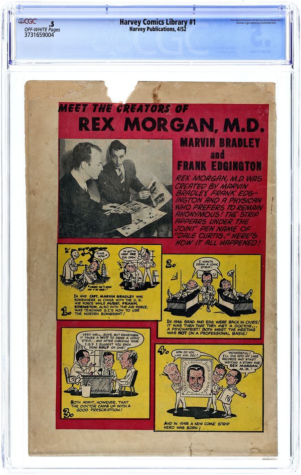 Cover by Marvin Bradley and Frank Edgington. Stories and art by Marvin Bradley and Frank Edgington. The first issue of this showcase series from future children's publisher Harvey has a place in comics history. It reprints the comic strip Rex Morgan, MD, by Marvin Bradley and Frank Edgington, featuring a standard anti-drug storyline. But the lurid pre-Code cover blurb and art attracted the attention of anti-comics crusader Dr. Frederic Wertham, who mentioned it in the text of his anti-comics classic Seduction of the Innocent (p. 27). The Comics Code, of course, was soon to follow. Rex Morgan, MD: Teen-Age Dope Slaves; Meet the Creators of Rex Morgan, M.D. 36 pages, Full Color. Cover price $0.10. Grade: CGC 0.5 explanation of grade Condition: Used (collectible)