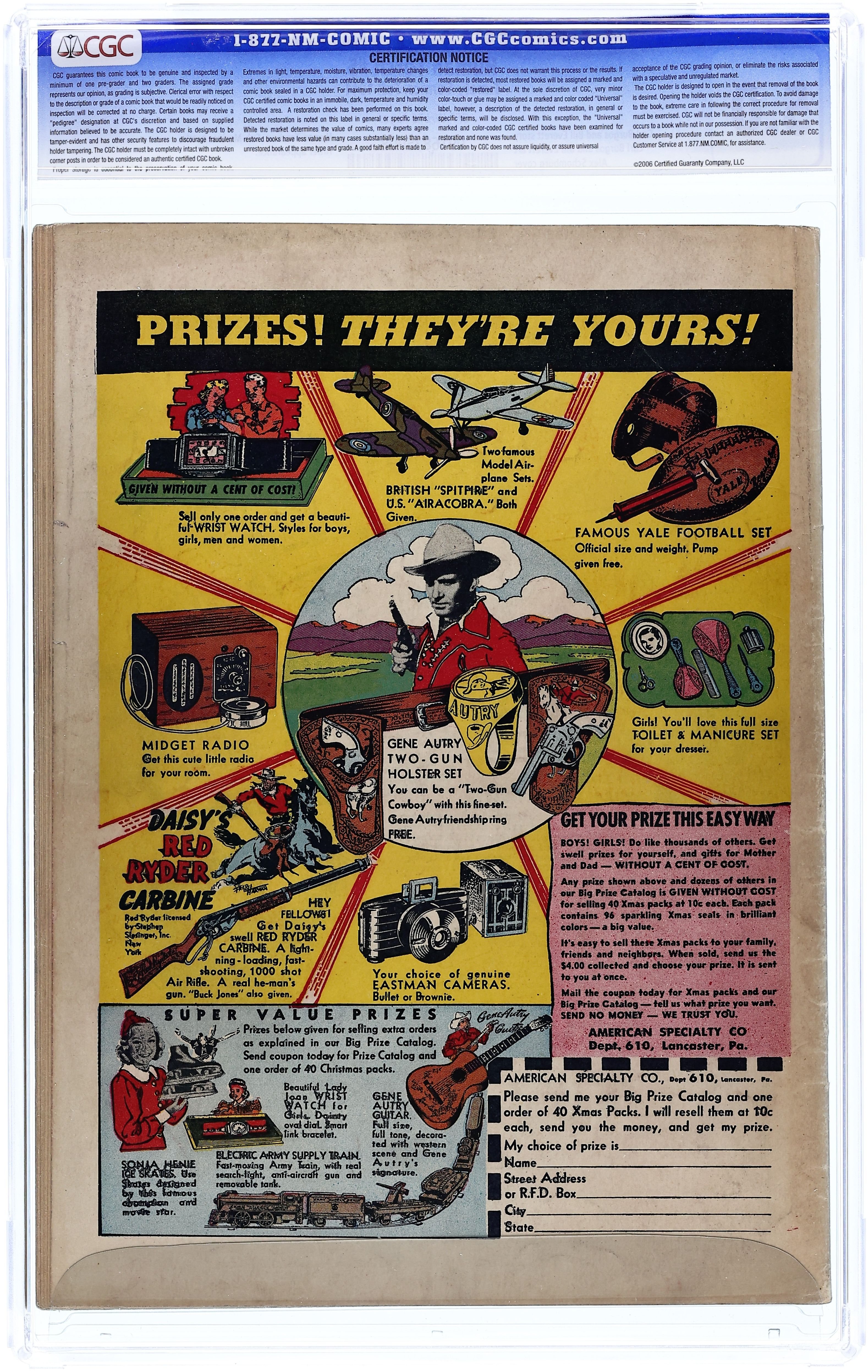 Note: 2 issues numbered #5. Cover art by Alex Schomburg. Ad for Daring Mystery Comics, which introduced Citizen V. The Human Torch Battles the Sub-Mariner As the World Faces Destruction, script by Carl Burgos, Bill Everett, Jack D'Arcy, and Hank Chapman, art by Carl Burgos, Bill Everett, Mike Roy, Harry Sahle, and George Kapitan; The Sub-Mariner gets his imperial kingdom to join in on the war against the Axis Powers, raging on above their heads....that is, until Rathia convinces him that he was meant to become the new Napoleon and conquer the world with her at his side!!! Tubby an' Tack humor page by Ray Houlihan. Murder in the Underground text story. 68 pgs. $0.10. Cover price $0.10. Grade: CGC 5.0 explanation of grade Condition: Used (collectible)