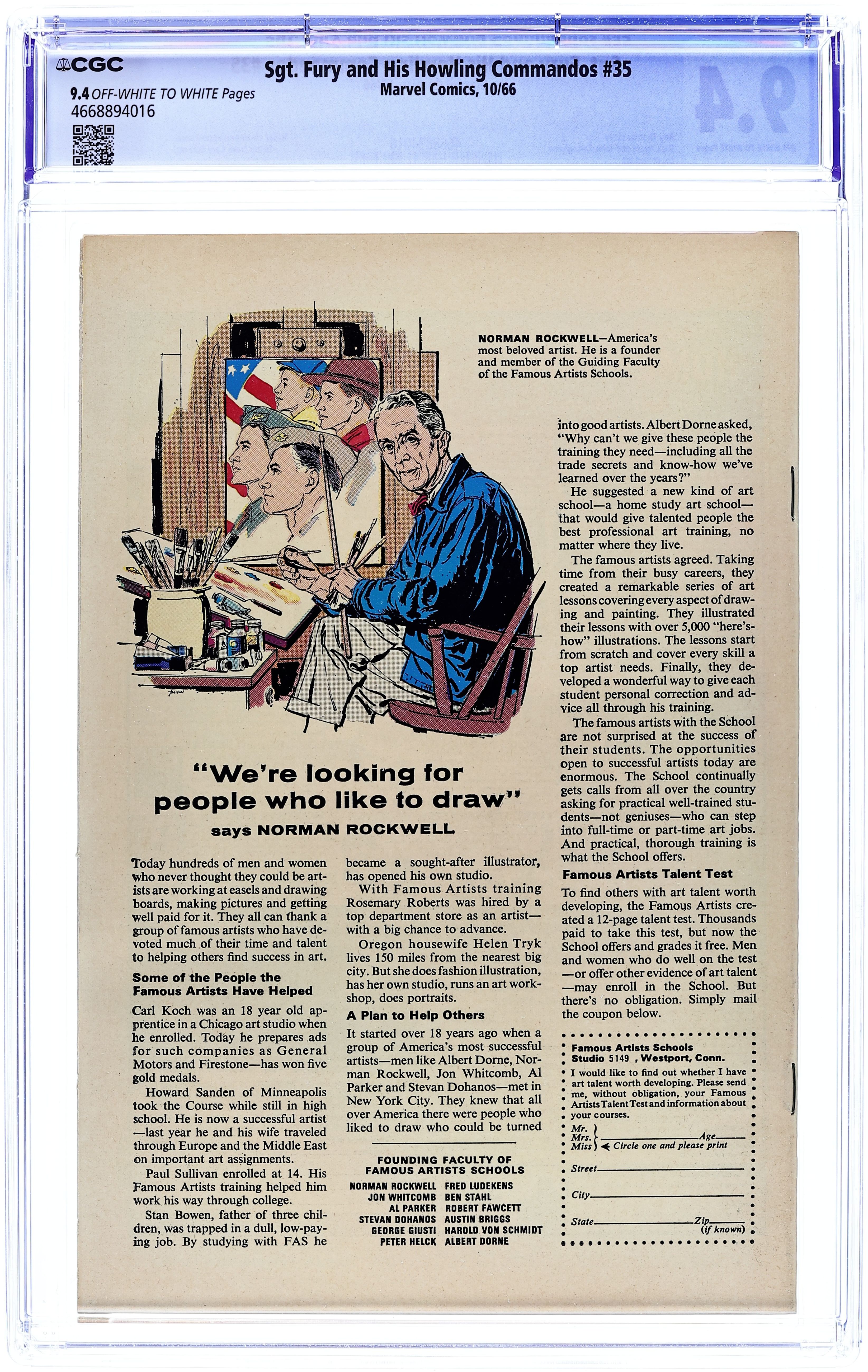 Cover pencils by Dick Ayers, inks by John Tartaglione. "Berlin Breakout!", script by Roy Thomas, pencils by Dick Ayers, inks by John Tartaglione; Captain Sawyer selects the members of the mission to rescue the Howlers, captured in Greece, who are bound for Berlin for a high-profile execution; Fury is given ex-Nazi Eric Koenig, Bull McGiveney, and his corporal, Rickets Johnson; They infiltrate the Berlin event with the help of Eric's sister, Ilsa, a double-agent working for the Nazis. They rescue the Howlers, but Dino Manelli is seriously wounded, and will not return to fight. Eric Koenig is named as his replacement. 36 pgs., full color. $0.12. Cover price $0.12. Grade: CGC 9.4 explanation of grade Condition: Used (collectible)
