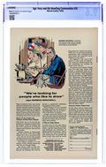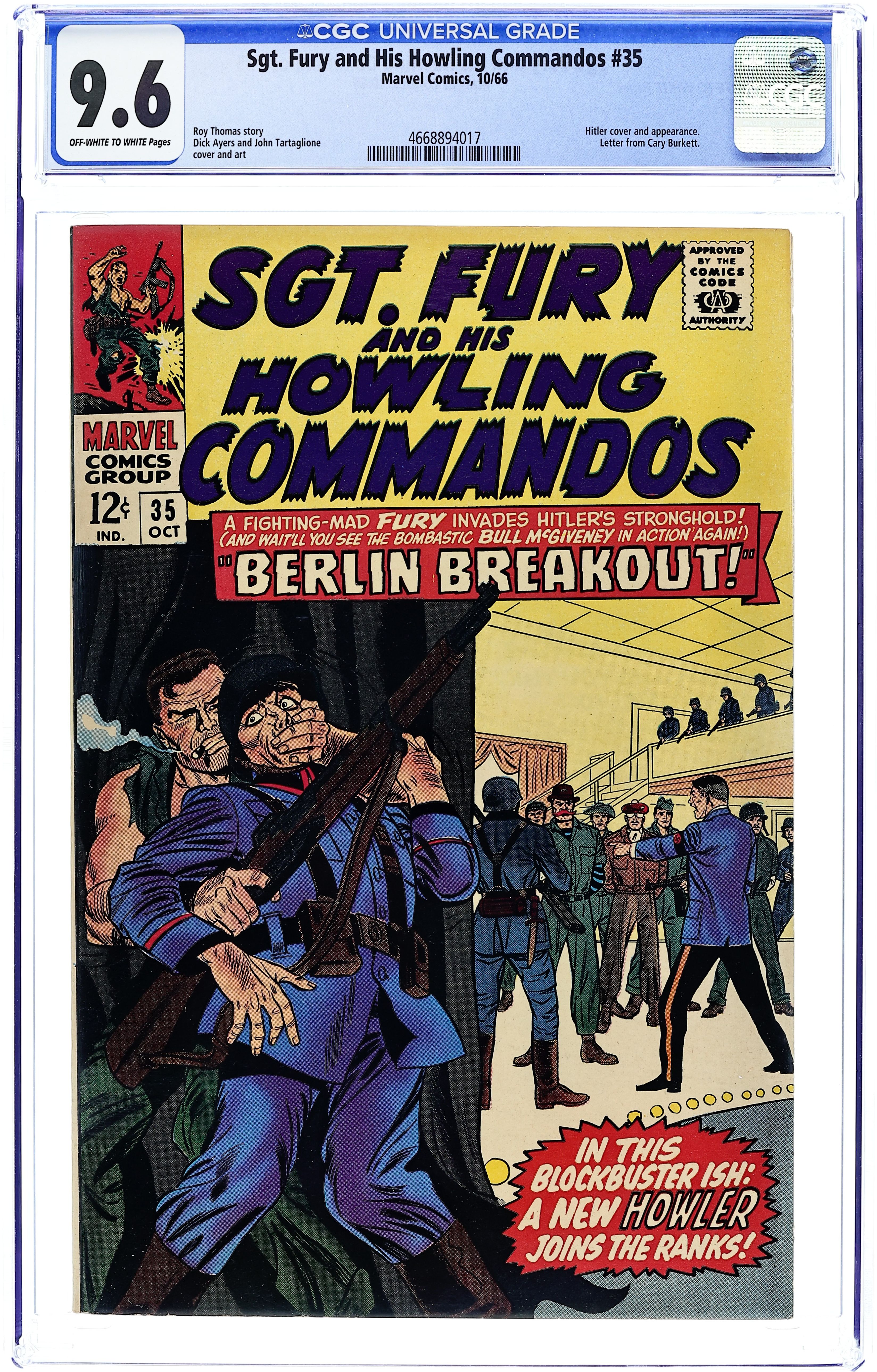 Cover pencils by Dick Ayers, inks by John Tartaglione. "Berlin Breakout!", script by Roy Thomas, pencils by Dick Ayers, inks by John Tartaglione; Captain Sawyer selects the members of the mission to rescue the Howlers, captured in Greece, who are bound for Berlin for a high-profile execution; Fury is given ex-Nazi Eric Koenig, Bull McGiveney, and his corporal, Rickets Johnson; They infiltrate the Berlin event with the help of Eric's sister, Ilsa, a double-agent working for the Nazis. They rescue the Howlers, but Dino Manelli is seriously wounded, and will not return to fight. Eric Koenig is named as his replacement. 36 pgs., full color. $0.12. Cover price $0.12. Grade: CGC 9.6 explanation of grade Condition: Used (collectible)