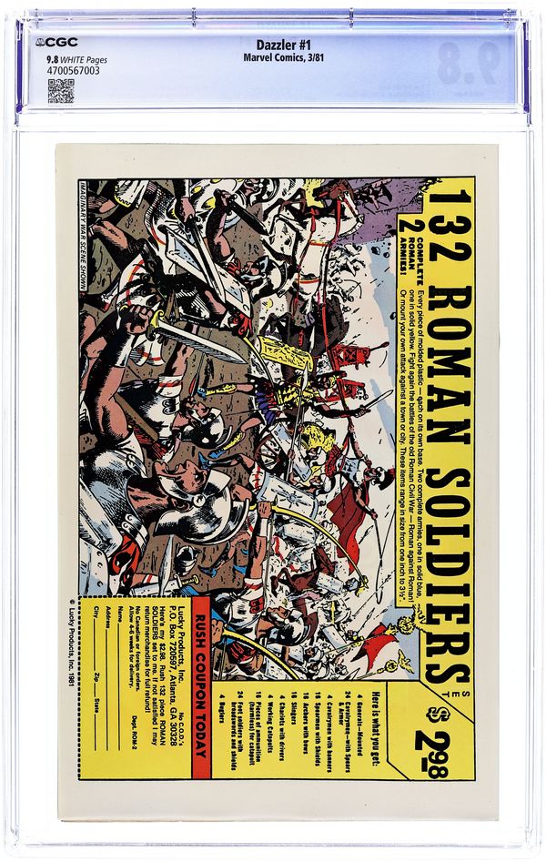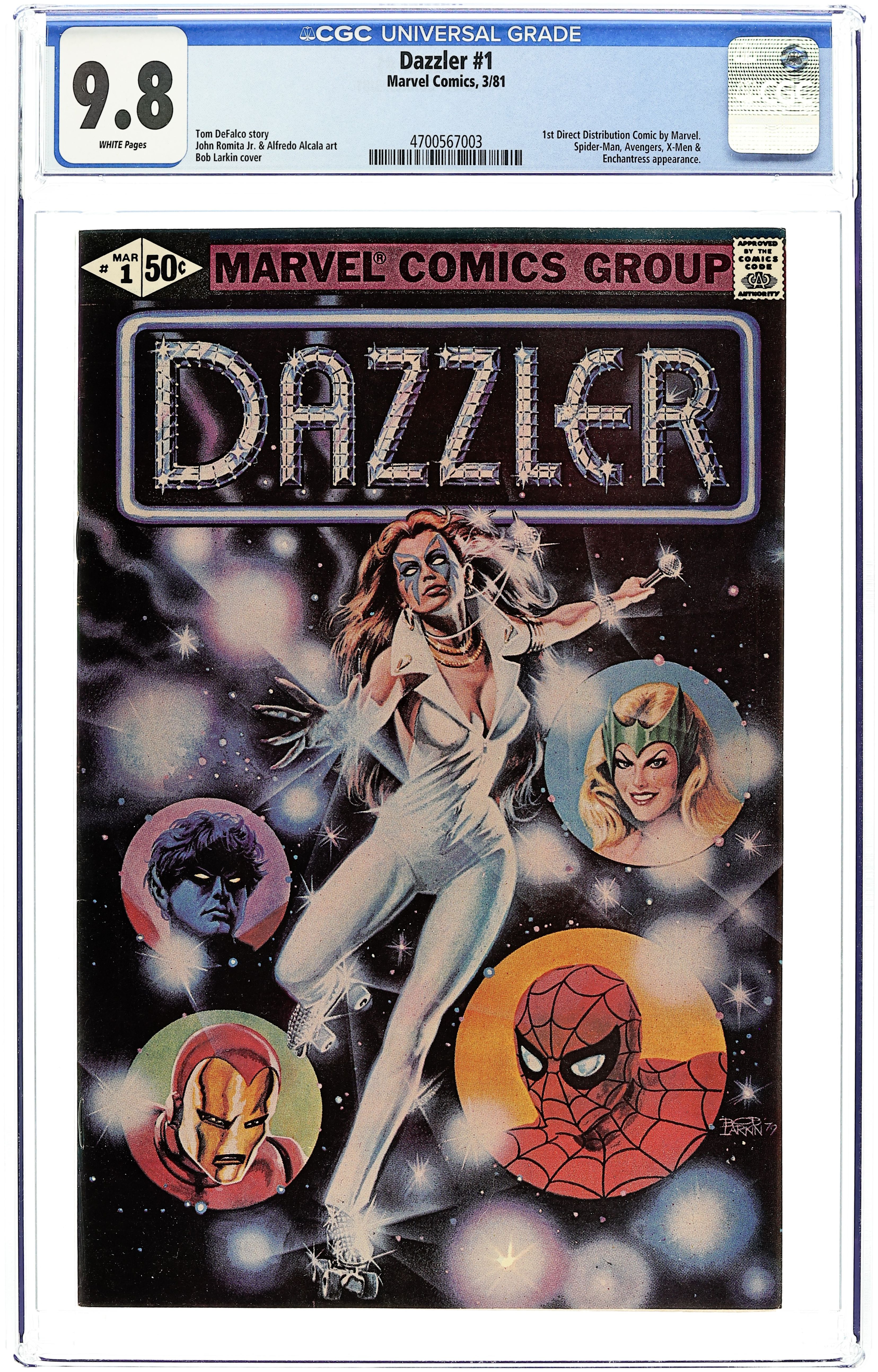 Starts May 18 Corrected version with pages 24 & 25 printed in color. Dazzler origin in "So Bright This Star." Script by Tom DeFalco, pencils by John Romite Jr., inks by Alfredo Alcala. Guest appearances by Spider-Man, the X-Men (Storm, Wolverine, Colossus, Nightcrawler, and Sprite), the Avengers (Hawkeye, the Beast, Iron Man, the Wasp, and Captain America), and the Enchantress. This issue was not sold on newsstands, but available only from direst-sale outlets. Bob Larkin painted cover. Cover price $0.50. Grade: CGC 9.8 explanation of grade Condition: Used (collectible)