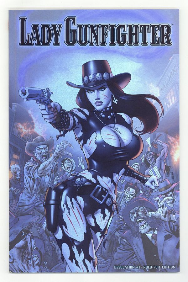 Starts May 18 Holo-Foil Edition Cover by Matt Merhoff. Story by Brian Pulido and Mike MacLean. Art by Joel Gomez. Set in 1876, post Civil War America. As a teenager, Eliza Ryan was Lady Gunfighter, star attraction of Winchester Willie's Traveling Wild West Show. But Eliza gave up her sharpshooting ways to become a loving wife and mother. Then came that fateful night of bloodshed and fire. Ten years later, Eliza dons the Lady Gunfighter moniker once again and journeys across the ultraviolent hellscape that is the old west. A demonic revolver rides in her gun belt, a weapon of dark power that whispers to Lady Gunfighter in an ancient, malevolent language. Will cursed bullets and sharpshooting skills be enough to stop the man responsible for destroying Eliza's family- the infamous killer Jebediah Kane? 52 pages, full color. Grade: VF+ 8.5 explanation of grade Condition: Used (collectible)