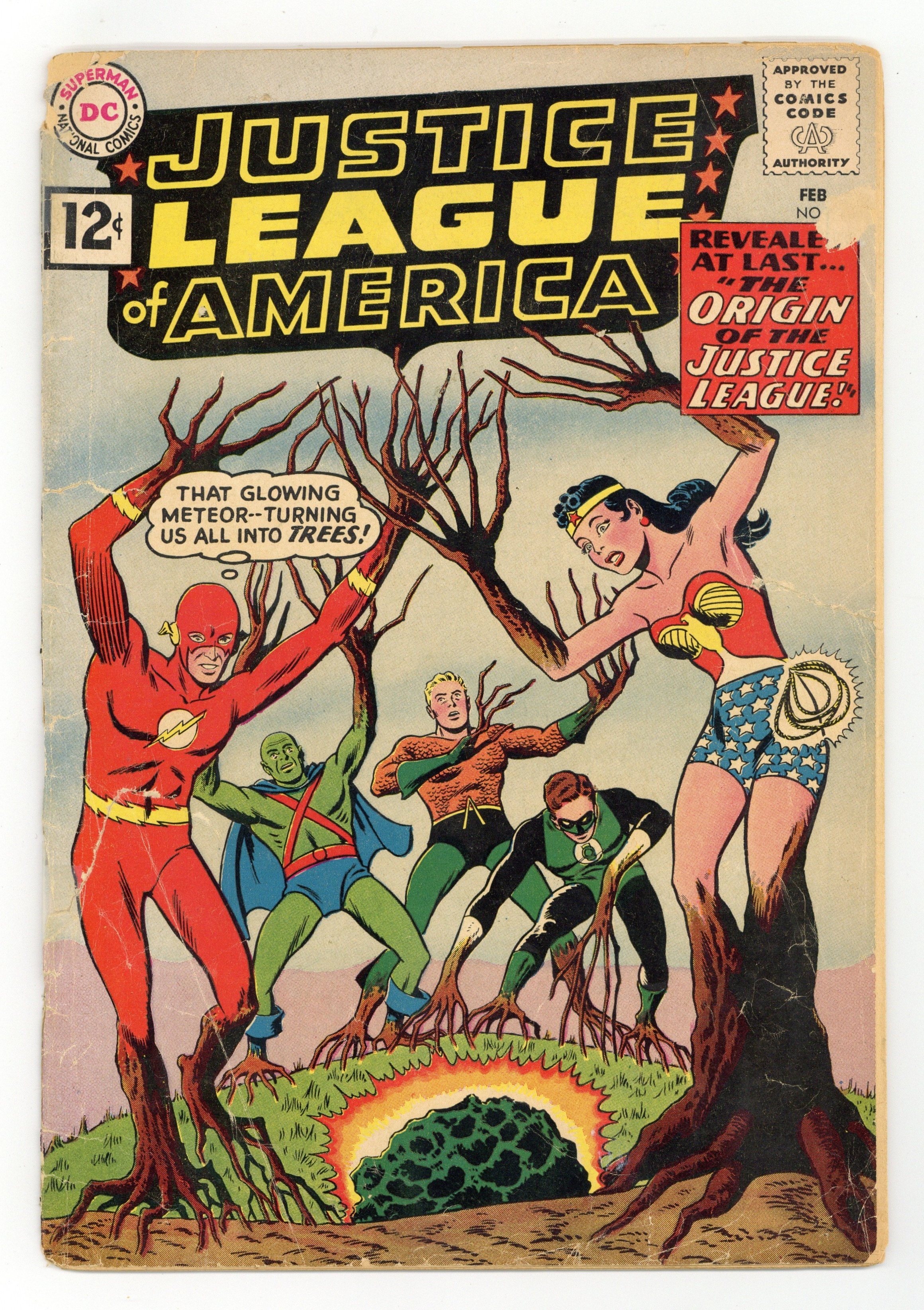 Starts May 18 Cover pencils by Mike Sekowsky, inks by Murphy Anderson. The Origin of the Justice League!, script by Gardner Fox, pencils by Mike Sekowsky, inks by Bernard Sachs; The Justice League of America uses the occasion of its third anniversary to tell Snapper Carr and Green Arrow about the formation of the League, involving the discovery of strange meteors that nearly doomed them forever; featuring the origin and first case of the JLA. Letter to the editor from comic artist Joe Staton. 36 pgs. $0.12. Cover price $0.12. Grade: PR 0.5 explanation of grade Condition: Used (collectible)