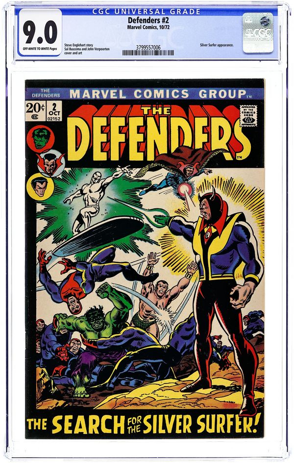 Cover pencils by Sal Buscema, inks by Frank Giacoia. The Secret of the Silver Surfer!, script by Steve Englehart, pencils by Sal Buscema, inks by John Verpoorten; Dr. Strange, Namor and Hulk travel to Asia to find out why Silver Surfer attacked Namor. Letter from Bob Rozakis. 36 pgs. $0.20. Cover price $0.20. Grade: CGC 9.0 explanation of grade Condition: Used (collectible)
