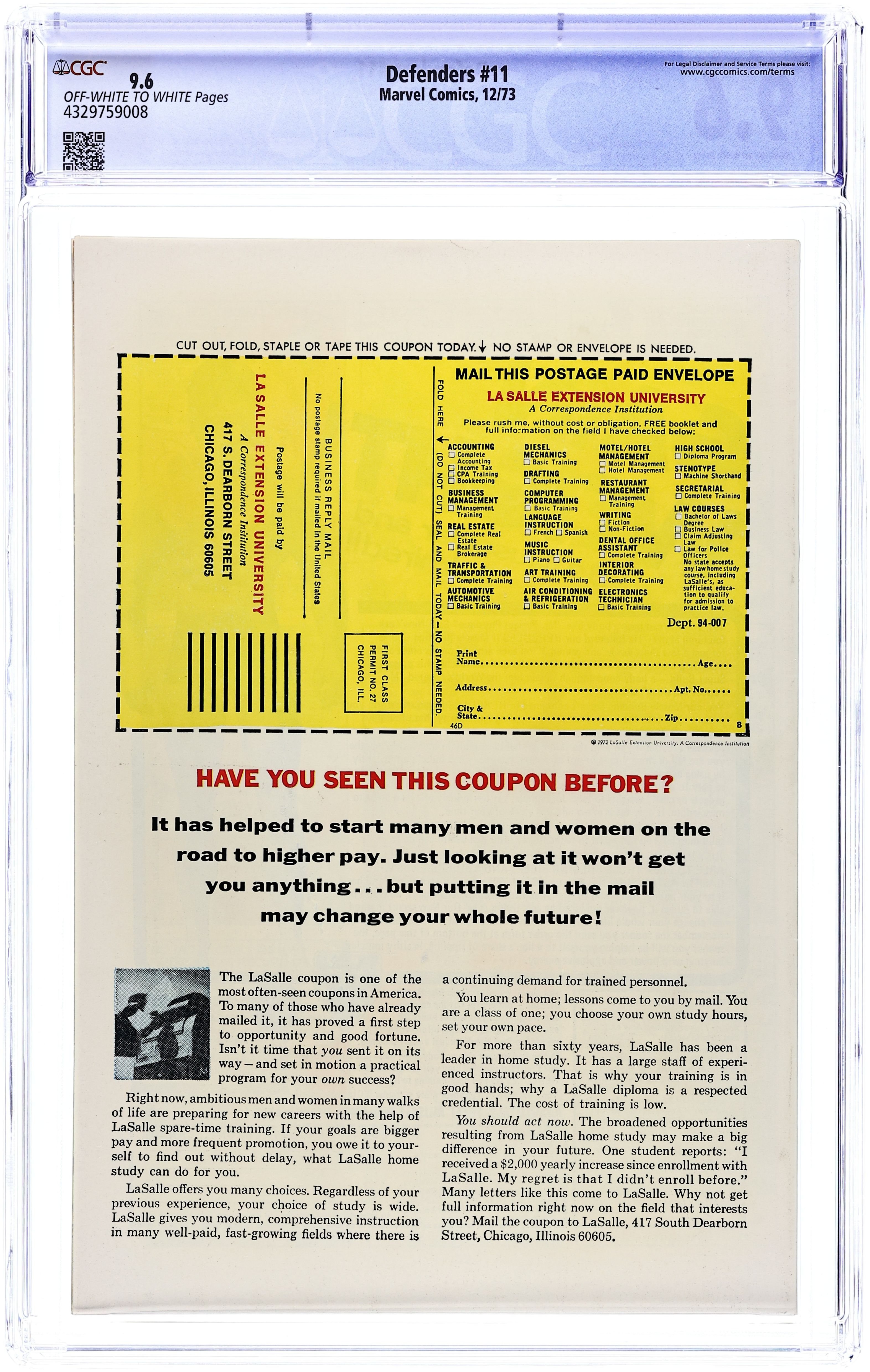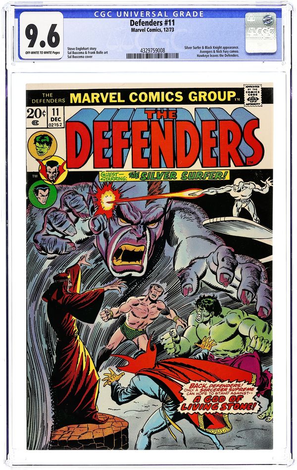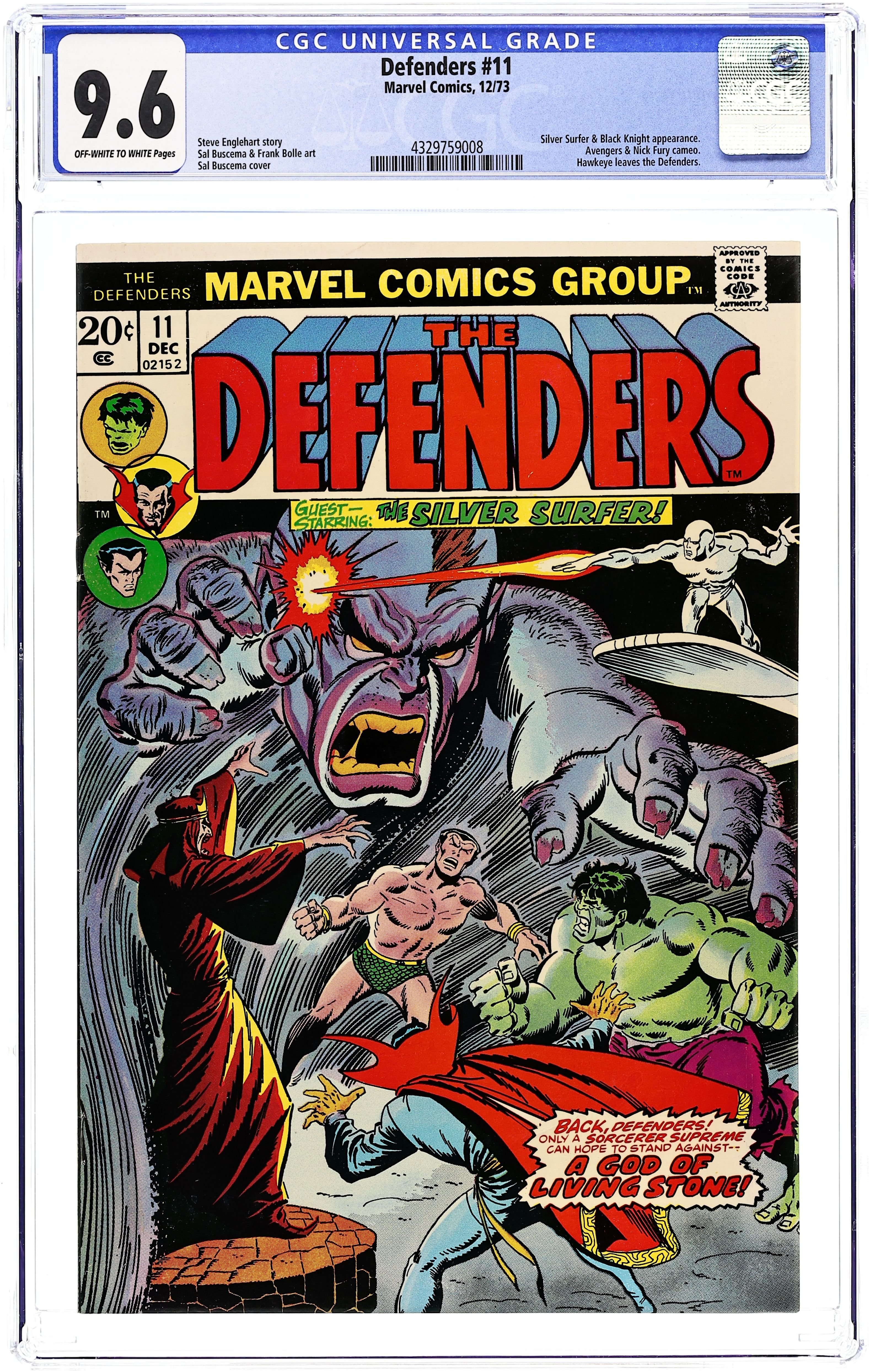 The Avengers/Defenders crossover continues with "A Dark and Stormy Knight." Script by Steve Englehart, pencils by Sal Buscema. Inks by Frank Bolle. Cover by John Romita. Story continues from Avengers 118. The epic battle vs. Dormammu is over and Earth has survived! But there's one more mission remaining for the Defenders! Return the Black Knight's stone body back to flesh and blood. To that end six defenders along with the Evil Eye travel back in time to the 12th century and find Dane Whitman smack dab in the middle of the Crusades! The super-heroes from the 20th century get a medieval history lesson as all the famous combatants are present: Prince John, Mordred the Evil, Chandu, Prester John, and Richard the Lionheart! Can the Dynamic Defenders save the King (and the Black Knight)? Cameo appearances by the Avengers, Nick Fury, and Loki. Defenders Lineup: Doctor Strange, Hawkeye, Hulk, Silver Surfer, Sub-Mariner, and Valkyrie. (Notes: Prester John previously appeared in Fantastic Four (1st series) 54. The 20th century stone statue of the Black Knight comes to life in Avengers 157. The 12th century Black Knight (aka Dane Whitman) and the Evil Eye return in Avengers 225 & 226.) 36 pgs. Cover price $0.20. Grade: CGC 9.6 explanation of grade Condition: Used (collectible)