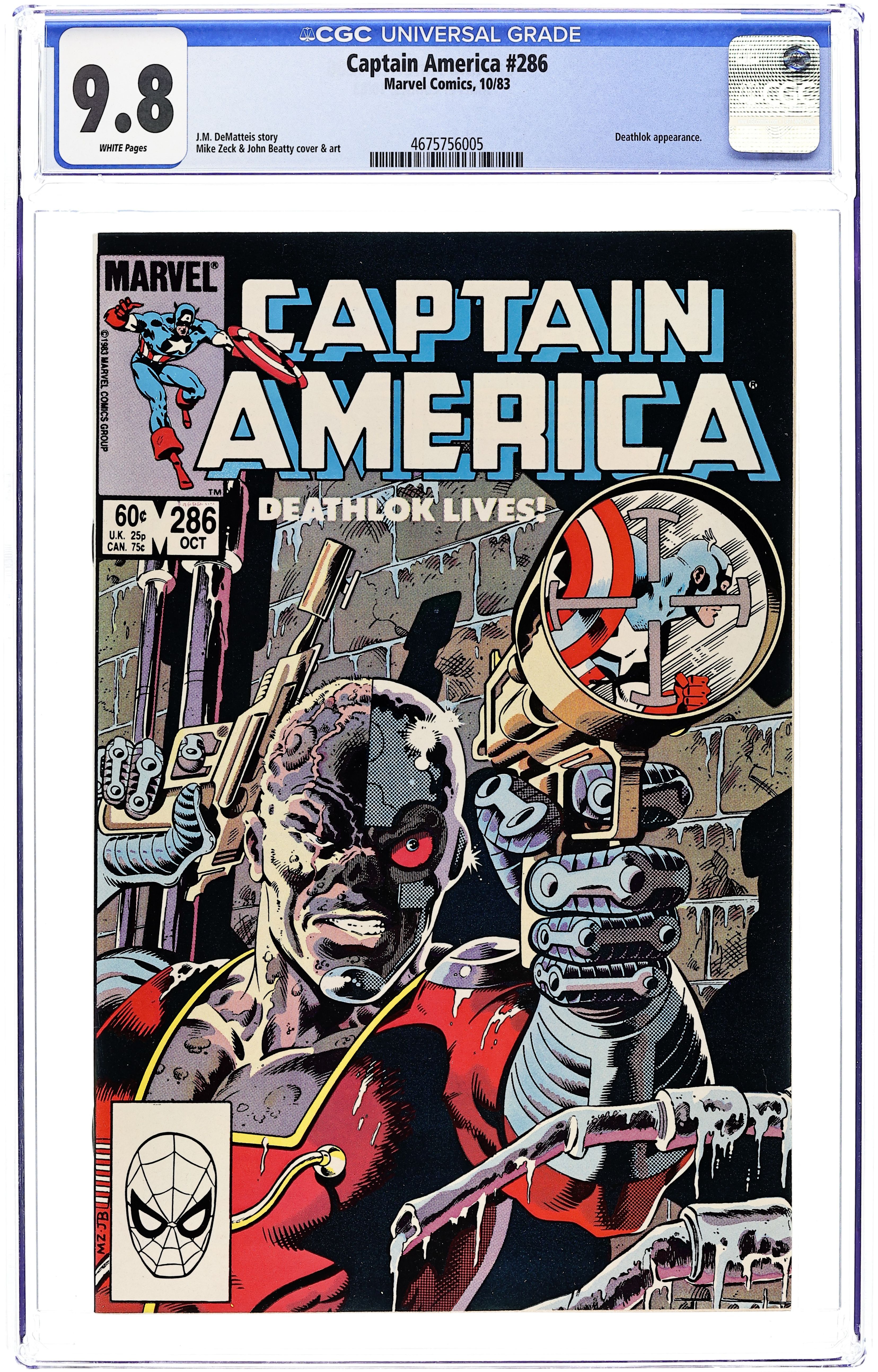 Direct Edition. "One Man in Search of Himself!" Part 1 of 3. Story by J.M. DeMatteis. Art by Mike Zeck and John Beatty. The story begins in a war-ravaged New York City circa 1991. The mysterious being Godwulf sends a clone of Luther Manning back to 1983 to find Deathlok. The clone's quest for Deathlok leads to the abandoned Brand Corporation facility on Long Island. Meanwhile, Steve Rogers and Bernie Rosenthal are driving to Bernie's parents' house for supper, when their travel route takes them by...the abandoned Brand Corporation facility on Long Island. What happens when a clone from the future meets a living legend from the present? Cameo appearance by Deathlok. (Note: This three-part saga was reprinted in 1993 in a single volume titled "Captain America? Deathlok Lives.") 36 pages Cover price $0.60. Grade: CGC 9.8 explanation of grade Condition: Used (collectible)