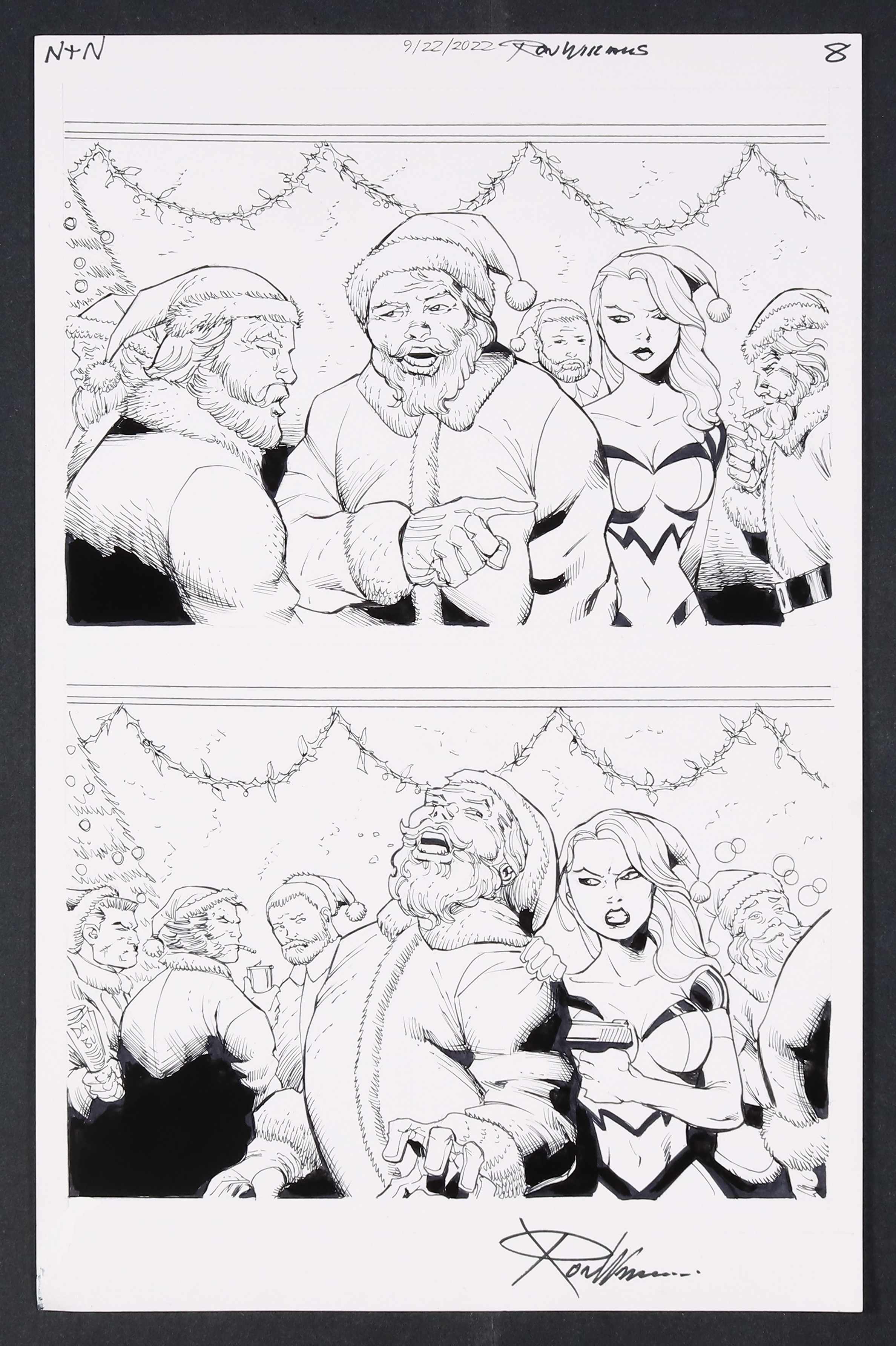 Nyce's mission to take out an imposter Santa gets tense as she tries to escort her target out of a Christmas party. Signed by the artist. Pencil and ink on art board. 11" x 17".