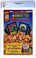 "The Hatred, the Horror and the Hero!" Maximum Carnage, Part 14 of 14. Script by Tom DeFalco. Chapter 1 - Art by Mark Bagley (breakdowns) and Sam de la Rosa (finishes). Chapter 2 - Art by Ron Lim (pencils), Jim Sanders III (inks), and Sam de la Rosa (inks). Cover by Ron Lim and Jim Sanders III. Story continues from Spectacular Spider-Man 203. In shocking fashion Carnage jumps out of Central Park Lake! Oh no, all the police and superheroes (besides the web-slinger) left a while ago thinking the bloodthirsty super-villain was dead! But he's still alive! And that means the Maximum Carnage saga is not over yet! Venom and Spider-Man battle Carnage first in Central Park, then at the St. Estes Home in Brooklyn, and finally in an old cemetery! Can the wondrous wall-crawler at long last corral Carnage? And also keep Venom from killing his symbiote offspring? After fourteen issues there's no telling how this tale will end! Appearances by the Black Cat, Mary Jane Watson, Aunt May, Richard Parker LMD, Mary Parker LMD, Liz Osborn, Normie Osborn, Thunderstrike, Sersi, and the Vision. Cameo appearances by Morbius and Nightwatch. Second Story: "Other People's Dreams." Script by Kurt Busiek. Pencils by Steven Butler. Inks by Bud LaRosa. The web-slinger clashes with Megawatt! Cameo appearance by Mary Jane Watson. Flashback cameos by Daredevil and Dr. Jonas Harrow. (Notes: Carnage returns in Amazing Spider-Man Annual 28. This issue is printed on glossy paper. The Maximum Carnage storyline was reprinted in 1994 in the trade paperback Spider-Man Maximum Carnage.) 64 pages. Cover price $3.95.