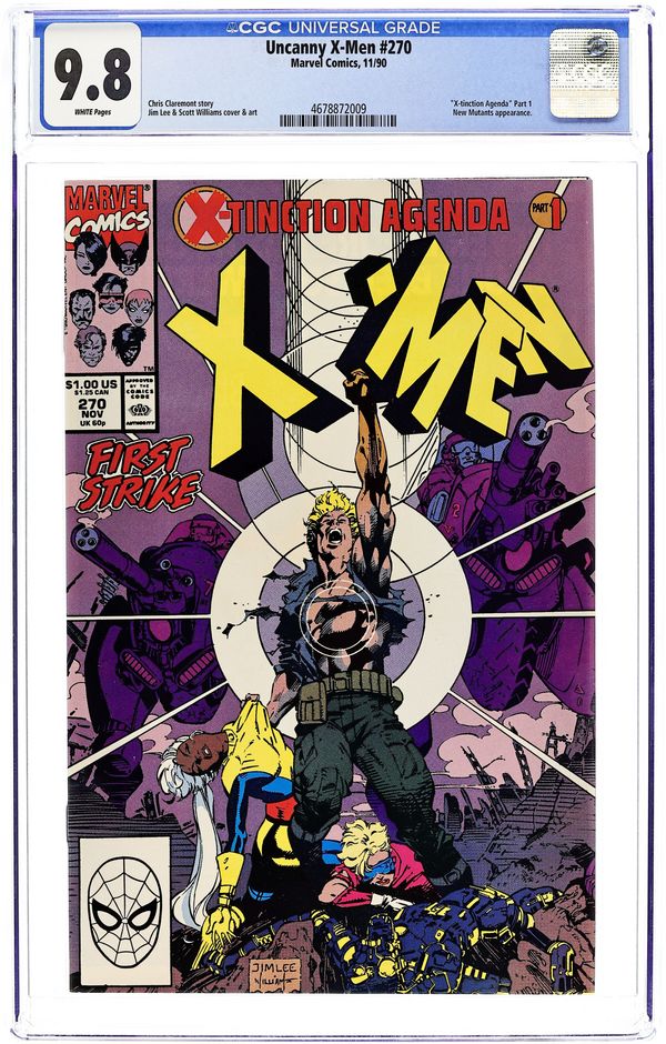 X-Tinction Agenda: Part 1 of 9. "First Strike!" Guest-starring Jean Grey, the New Mutants. Story by Chris Claremont. Art by Jim Lee, Art Thibert, and Scott Williams. Cover by Jim Lee and Scott Williams. The nation of Genosha declares war on the Children of the Atom. And not everyone will survive the "First Strike!" Story continues in New Mutants #95. 36 pgs. Cover price $1.00.