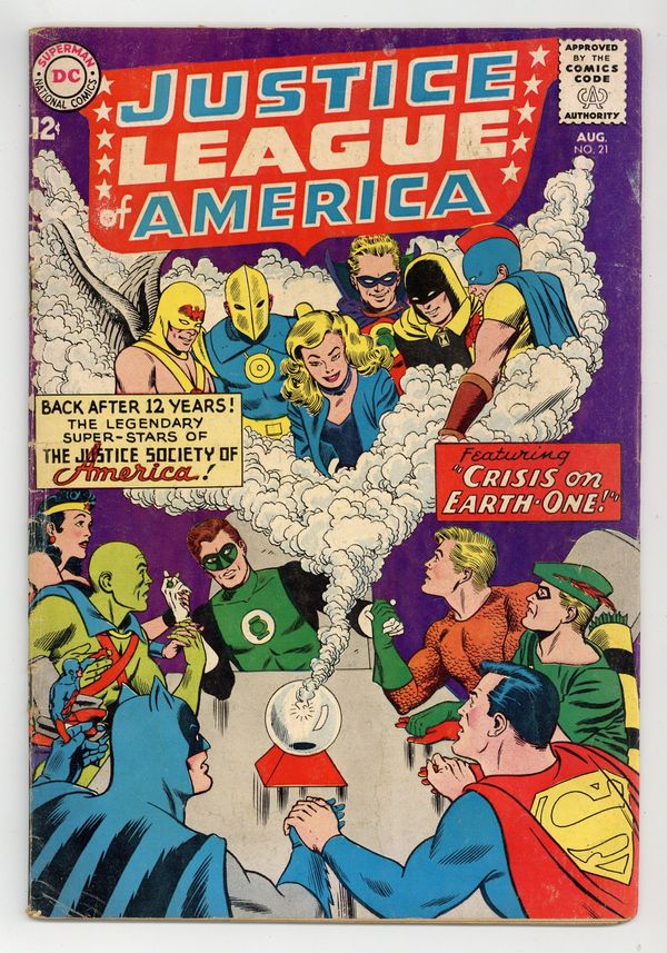 Starts Apr 4 1st Silver Age appearances of Hourman and Dr. Fate. Cover pencils by Mike Sekowsky, inks by Murphy Anderson. Crisis on Earth-One!, script by Gardner Fox, pencils by Mike Sekowsky, inks by Bernard Sachs; 3 villains each from Earth-1 and Earth-2 hatch a plot to commit crimes, then hide out on the other Earth; To ensure their success, the villains of Earth-1 mystically trap the JLA in their headquarters; But the JLA summons the JSA and switches places with them. Letter to the editor from Comics Buyer's Guide editor Don Thompson. 36 pgs. $0.12. Cover price $0.12.