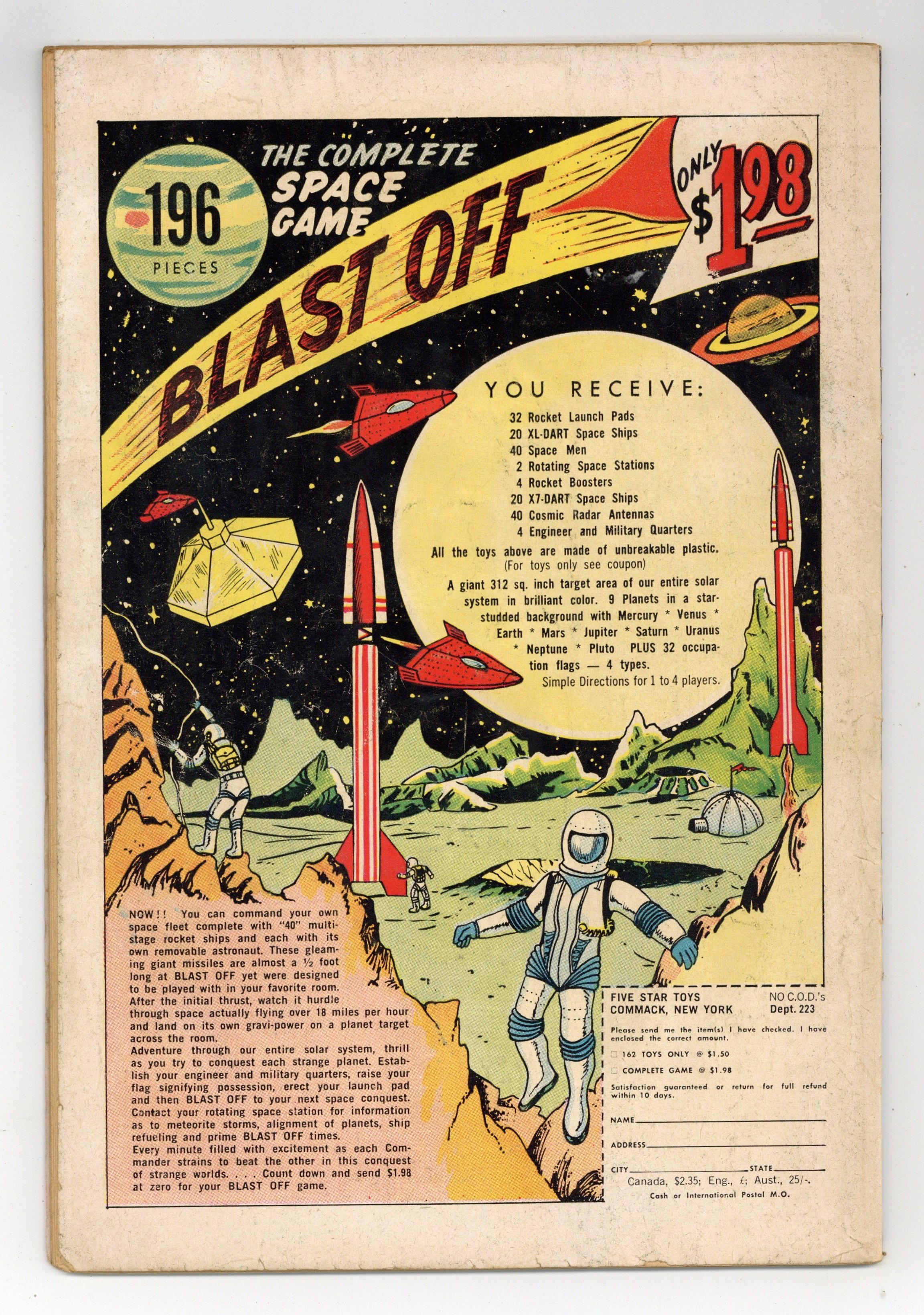 Ends Dec 29 8:39 PM CST Bid History 6 bids Current Bid $38 Your Secret Max Bid If you'd like to bid, please log in or register. Cover pencils by Mike Sekowsky, inks by Murphy Anderson. Earth--Without a Justice League!, script by Gardner Fox, pencils by Mike Sekowsky, inks by Bernard Sachs; The Johnny Thunder of Earth-1 takes control of the Earth-2 counterpart's Thunderbolt after the Johnny of Earth-2 accidentally asks T-Bolt to transport him to Earth-1 to meet his counterpart (since he wondered if he had a counterpart on Earth-1 like the other heroes); The Earth-1 Johnny then goes back in time to prevent the JLAers from existing when they stop T-Bolt from committing crimes for him; After being defeated by the JSA later on, he has the Thunderbolt go back in time again to create a Lawless League (based off the JLA's origins) from his criminal associates to confront the JSA on Earth-1. Letter to the editor from comics writer Mike Friedrich. Rocky and Bullwinkle star in a one-page Cheerios ad. 36 pgs. $0.12. Cover price $0.12.