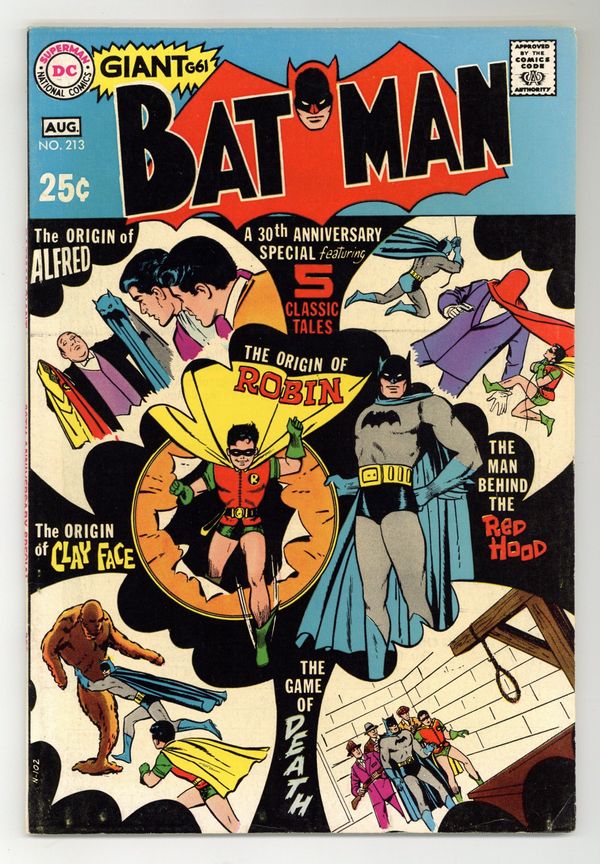 Starts Jan 26 DC Giant G-61; 30th anniversary issue. "The Origin of Robin" (new story; script by E. Nelson Bridwell, pencils by Ross Andru, inks by Mike Esposito) "Here Comes Alfred," the original origin of Alfred, from Batman no. 16 (April-May, 1943). "The Game of Death," from Star Spangled Comics no. 127 (April, 1952). "The Man Behind the Red Hood," one of the most important stories in the Batman mythos, from Detective no. 168 (February,1951). "The Challenge of Clay-Face," the origin of the second Clay-face, from Detective no. 298 (December, 1961). 68 Pages, Full Color. Cover price $0.25.