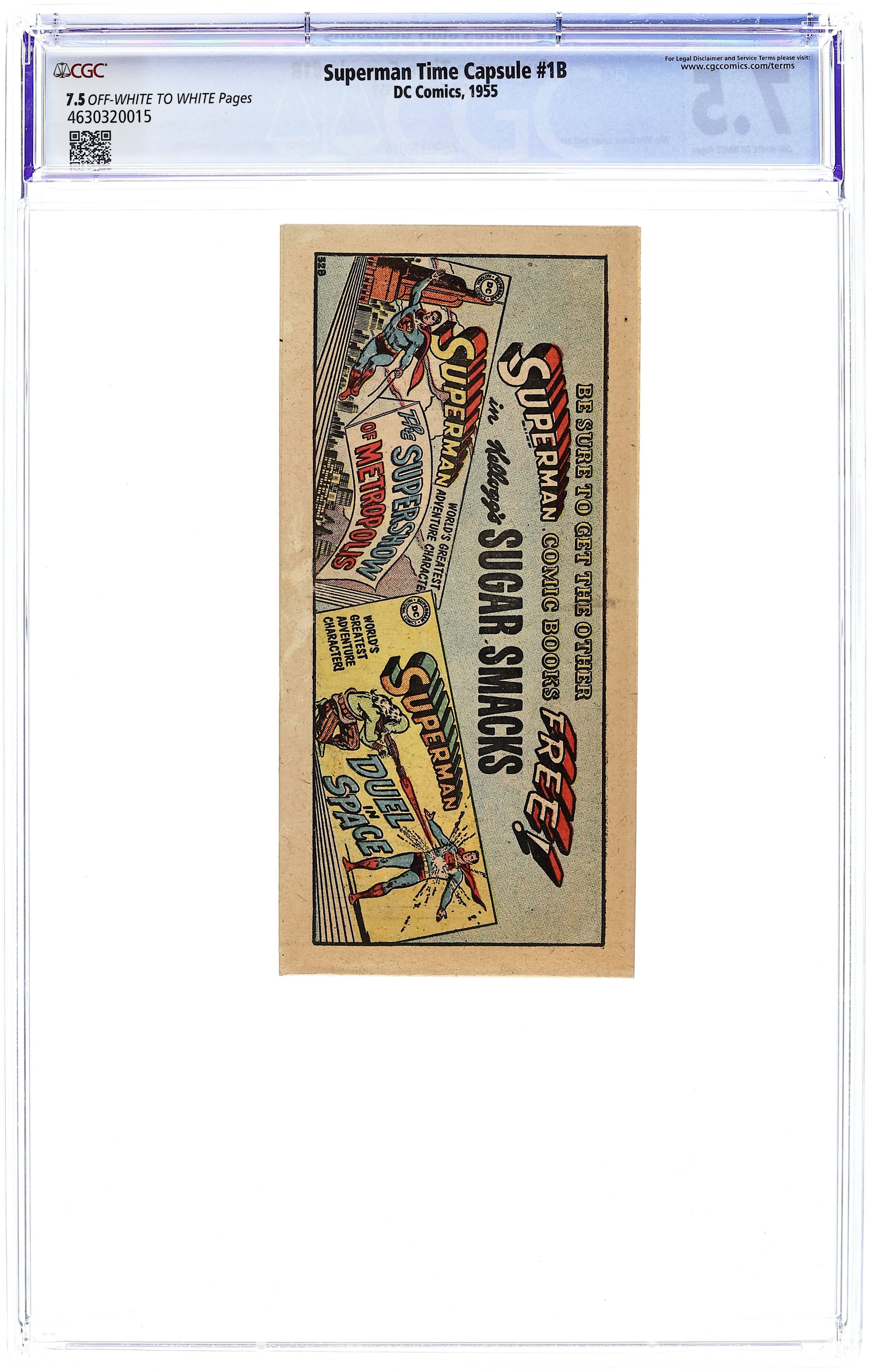 Issue #1. Superman Time Capsule, a 1955 Kellogg's Sugar Smacks giveaway. 32-page full-color promotional comic, 6-7/8-in. x 3-1/8-in., newsprint, no cover price. Two other mini comics in series (advertized on back cover): "The Supershow of Metropolis!" and "Duel in Space!"