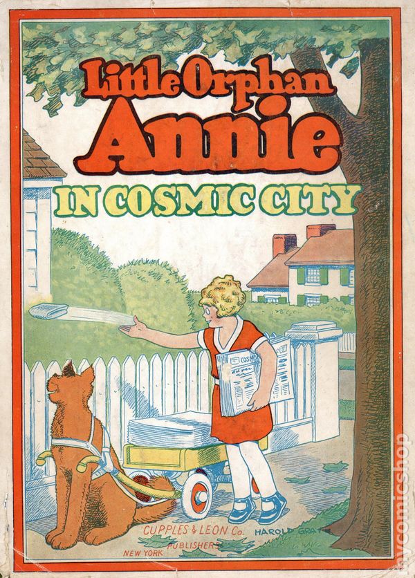 No dust jacket. Little Orphan Annie in Cosmic City (1933), written and illustrated by Harold Gray, is a comic published by Cupples & Leon Company. It is book 8 in the Little Orphan Annie book series and reprints 1932 strips. Follow the adventures of Little Orphan Annie as she tries to make money in the weeks leading up to Christmas. 92 pages, squarebound, color cover with black and white illustrations, 6-in x 8.75-in., no cover price.