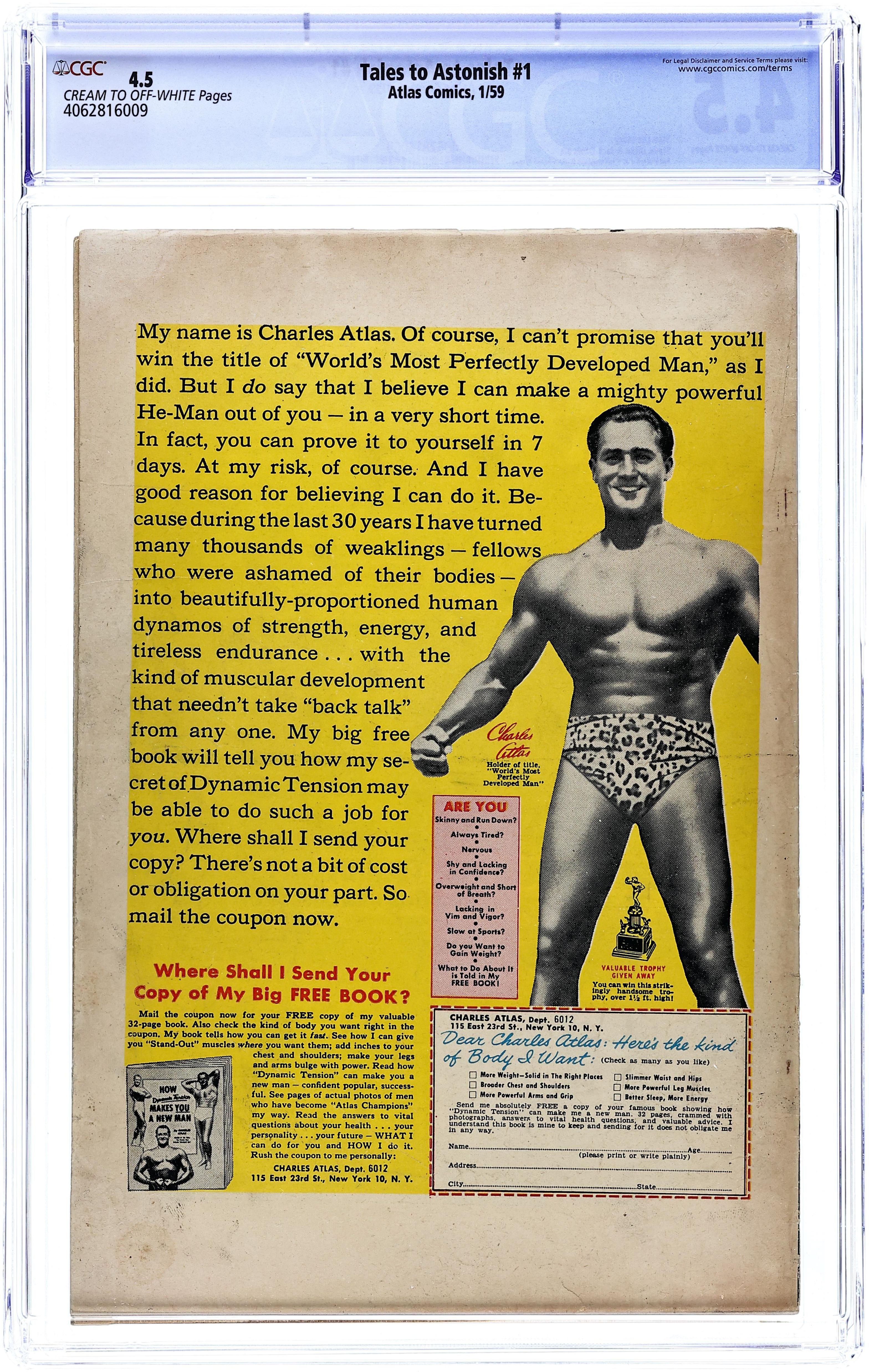 The first appearance and origin of the Incredible Hulk in "The Coming of the Hulk." Script by Stan Lee, pencils by Jack Kirby, inks by Paul Reinman. 1st app. Rick Jones, General Ross, and Betty Ross. It's the height of the Cold War and the government is about to test their new Gamma Bomb. Unfortunately, a carefree and oblivious teenager named Rick Jones wanders out onto the test area. Dr. Bruce Banner, the creator of the Gamma Bomb, rushes out to warn the young man away. However, the bomb explodes and as Banner pushes the teenager to safety he is caught in the heart of a Gamma maelstrom. The gamma-rays that bombard Banner's thin frame transform his physiology. Now, whenever Banner becomes angry he transforms into the man-brute known as the Incredible Hulk. Feared by the public and hunted by the army, the Hulk becomes one of the most tragic figures in Marvel's history. General "Thunderbolt" Ross will not rest until the Hulk is destroyed. The creature's only allies are Rick Jones and Betty Ross, Thunderbolt's daughter and Banner's one true love. Thus begins the epic saga of the world's mightiest mortal. NOTE: Notice that the Hulk was colored grey for the first few issues of his series. In an interview, Stan Lee (creator) said very simply that the reason for this was that grey was the easiest color for the copiers of the time to print. When the technology got better the Hulk became green, and according to Stan, for no better reason than they didn't have a green hero in their stable yet. 36 pgs. Cover price $0.12.