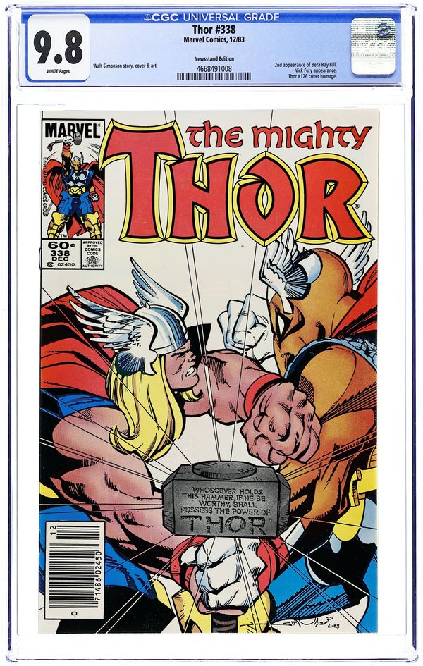 Ends Dec 29 9:35 PM CST Bid History 5 bids Current Bid $62 Your Secret Max Bid If you'd like to bid, please log in or register. Newsstand Edition. Cover by Walt Simonson. Beta Ray Bill (first appearance) becomes Thor in "Doom!", script and art by Walt Simonson; Nick Fury asks Thor's aid in investigating an alien ship heading for earth; Thor arrives and triggers the awakening of an alien protector, Beta Ray Bill; Bill bests Thor and takes up his hammer only to be accidentally summoned to Asgard by Odin who thinks he is summoning Thor. Brief appearances by Nick Fury, Loki, Sif, Balder, Heimdall, Volstagg, and Odin. First appearance of Lorelei (sister of the Enchantress). Begins Walt Simonson's run on Thor (through #382). Bullpen Bulletins. Star Frontiers TSR ad. 36 pgs., full color. $0.60. Cover price $0.60.