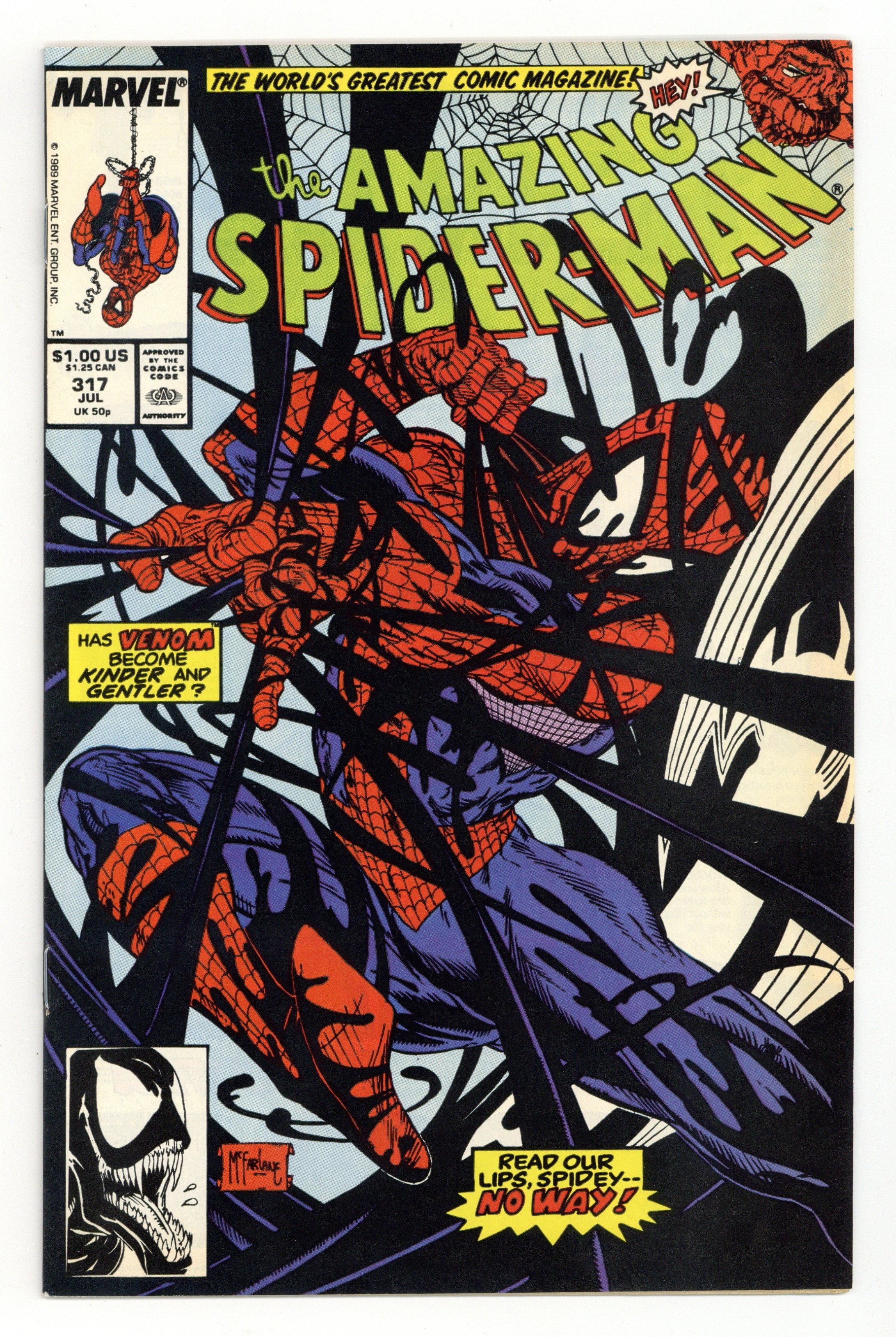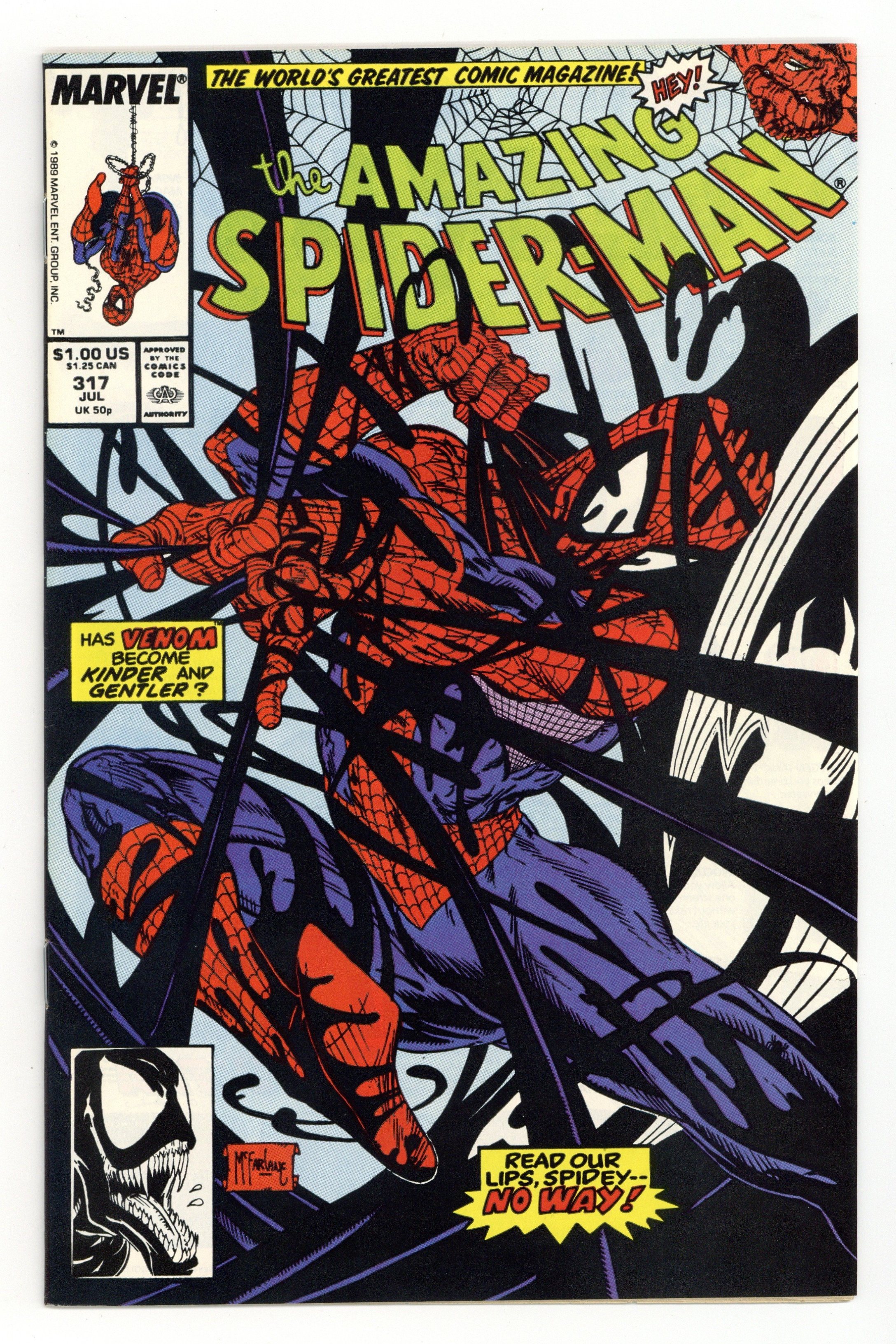 Starts Apr 4 Direct Edition. Giant-sized 25th anniversary issue. First full appearance of Venom in "Venom!", script by David Michelinie, art by Todd McFarlane; Spidey's old alien costume has merged with reporter Eddie Brock who thinks his career was ruined by Spider-Man and the symbiote of the two, Venom, takes on the web slinger; At MJ's request, Spidey returns to the blue and red costume as she now finds his black duds way too creepy; This is the last issue in which Spider-Man appears in his black costume; Thing (of the Fantastic Four) cameo.. Stan's Soapbox Special in place of letters page: Full page editorial by Stan on the occasion of Spider-Man's 300th issue. 52 pgs., full color. Cover price $1.50.