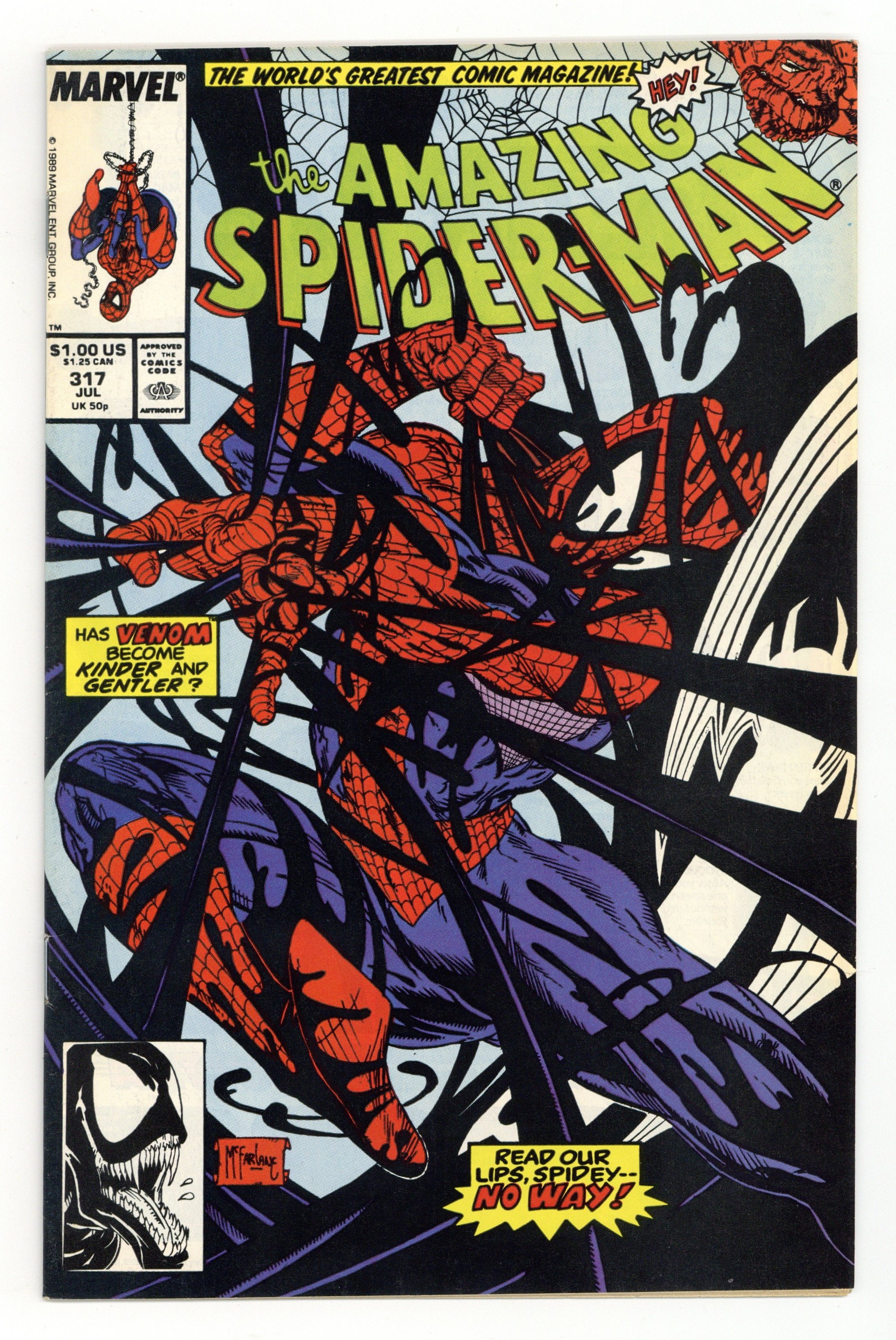 Starts Mar 9 Direct Edition. Giant-sized 25th anniversary issue. First full appearance of Venom in "Venom!", script by David Michelinie, art by Todd McFarlane; Spidey's old alien costume has merged with reporter Eddie Brock who thinks his career was ruined by Spider-Man and the symbiote of the two, Venom, takes on the web slinger; At MJ's request, Spidey returns to the blue and red costume as she now finds his black duds way too creepy; This is the last issue in which Spider-Man appears in his black costume; Thing (of the Fantastic Four) cameo.. Stan's Soapbox Special in place of letters page: Full page editorial by Stan on the occasion of Spider-Man's 300th issue. 52 pgs., full color. Cover price $1.50.