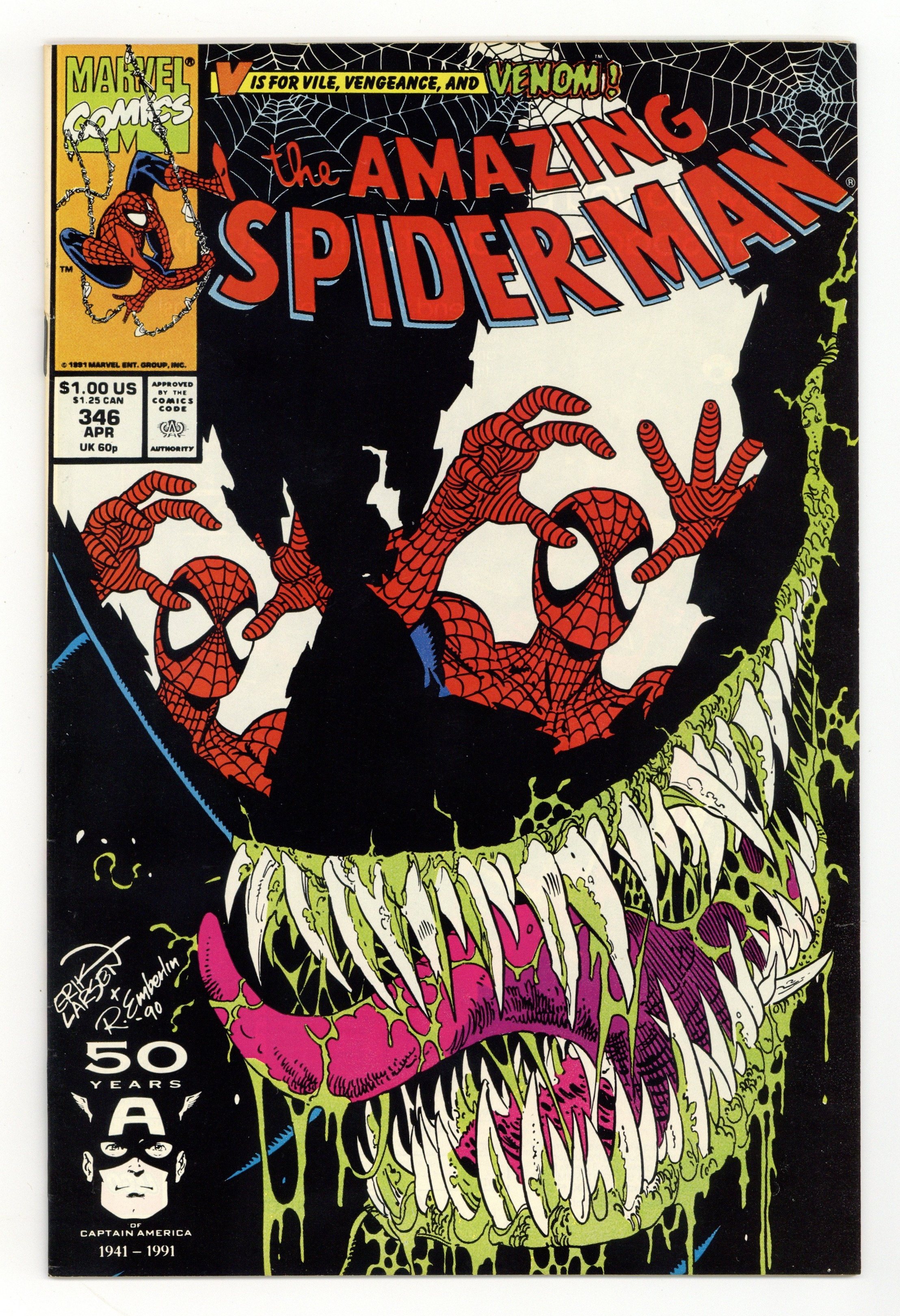 Ends Mar 9 7:18 PM CST Bid History 7 bids Current Bid $25 Your Secret Max Bid If you'd like to bid, please log in or register. Direct Edition. Cover pencils by Erik Larsen, inks by Randy Emberlin. "Elliptical Pursuit!", script by David Michelinie, pencils by Erik Larsen, inks by Randy Emberlin; Eddie Brock is back…for Peters head!; After escaping prison, Venom taunts Spider-Man into a final showdown; Peter Parkers known for his smarts--why then does he stumble straight into Venoms trap?; An all-out smack down slugfest ensues. 36 pgs., full color. Cover price $1.00.
