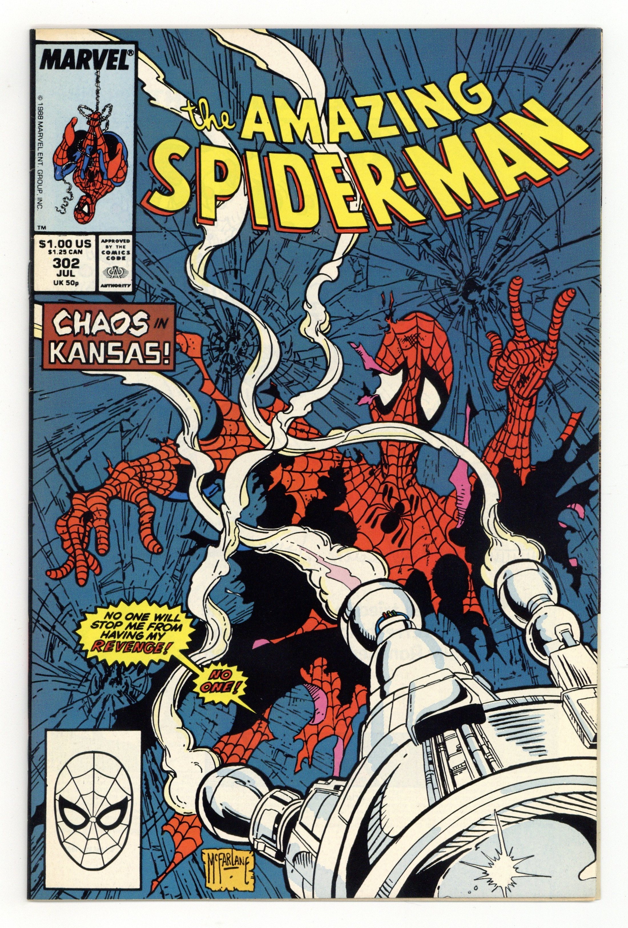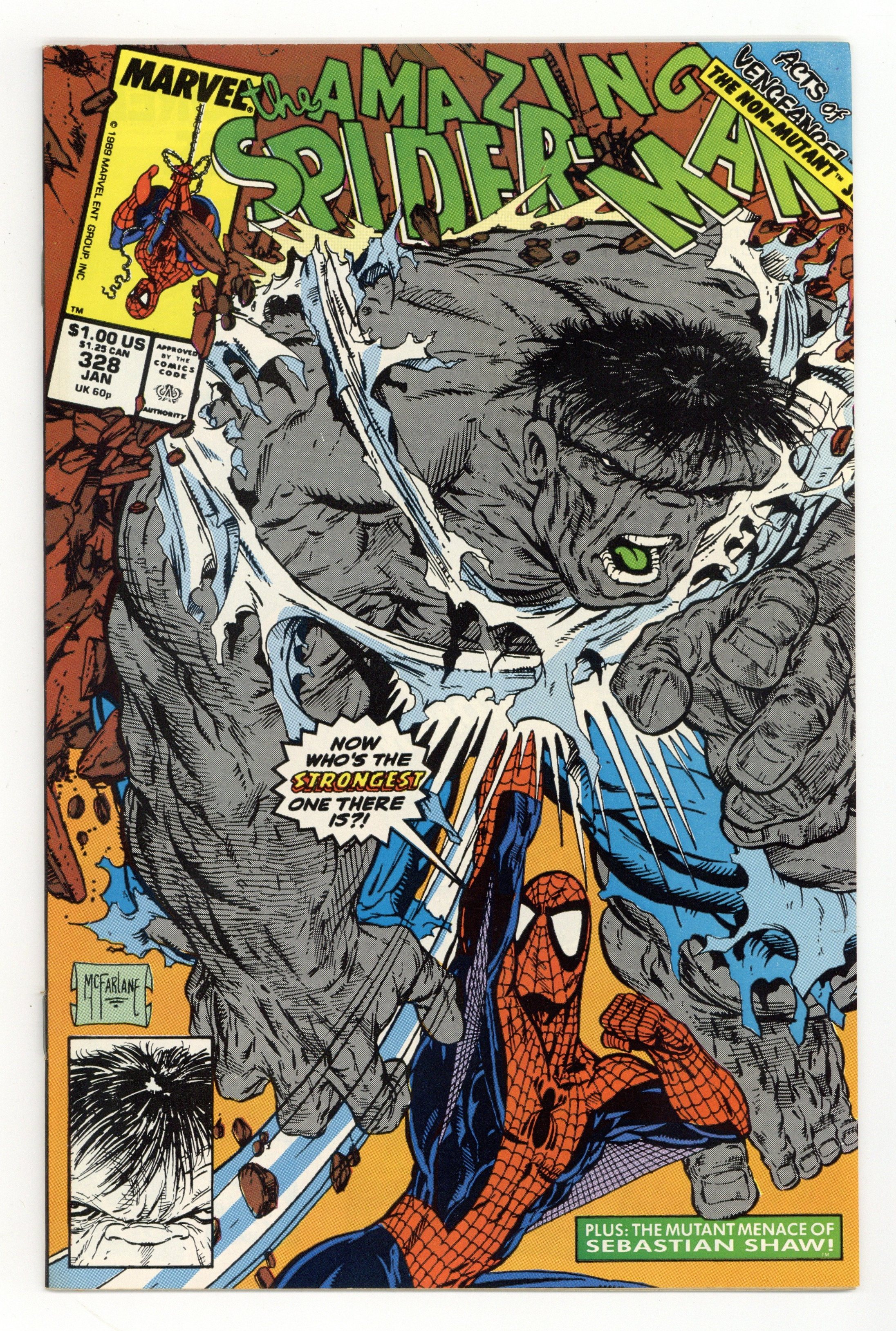 Starts Mar 9 Direct Edition. "Shaw's Gambit" Acts of Vengeance crossover. Guest-starring the Hulk. Script by David Michelinie. Art by Todd McFarlane. Cover by Todd McFarlane. Plot continues from Web of Spider-Man 60. The powerful cabal masterminding the Acts of Vengeance is still trying to kill the web-slinger despite his new cosmic powers! And the next super-villain gunning for Spidey is Sebastian Shaw! However the Hellfire Club's Black King likes to fight by proxy! And who better to use than the Hulk! Shaw picks up the former Green Goliath in the Nevada desert and drops him in the middle of Manhattan! And the battle is joined! The cosmic-powered wall-crawler and the gamma-radiated Hulk throw down from Times Square to the Roosevelt Island ruins! An out-of-this-world ending! Plot continues in Spectacular Spider-Man 160. Cameo appearances by Mary Jane Watson and Flash Thompson. (Notes: This issue completes Todd McFarlane's dynamic 2-year run as the penciler of the Amazing Spider-Man series -- highlighted by the co-creation of Venom (aka Eddie Brock) and the initial Venom story arcs in issues 298-300 and 315-317. This story was reprinted in 1993 in the trade paperback: Spider-Man -- The Cosmic Adventures.) 32 pages. Cover price $1.00.