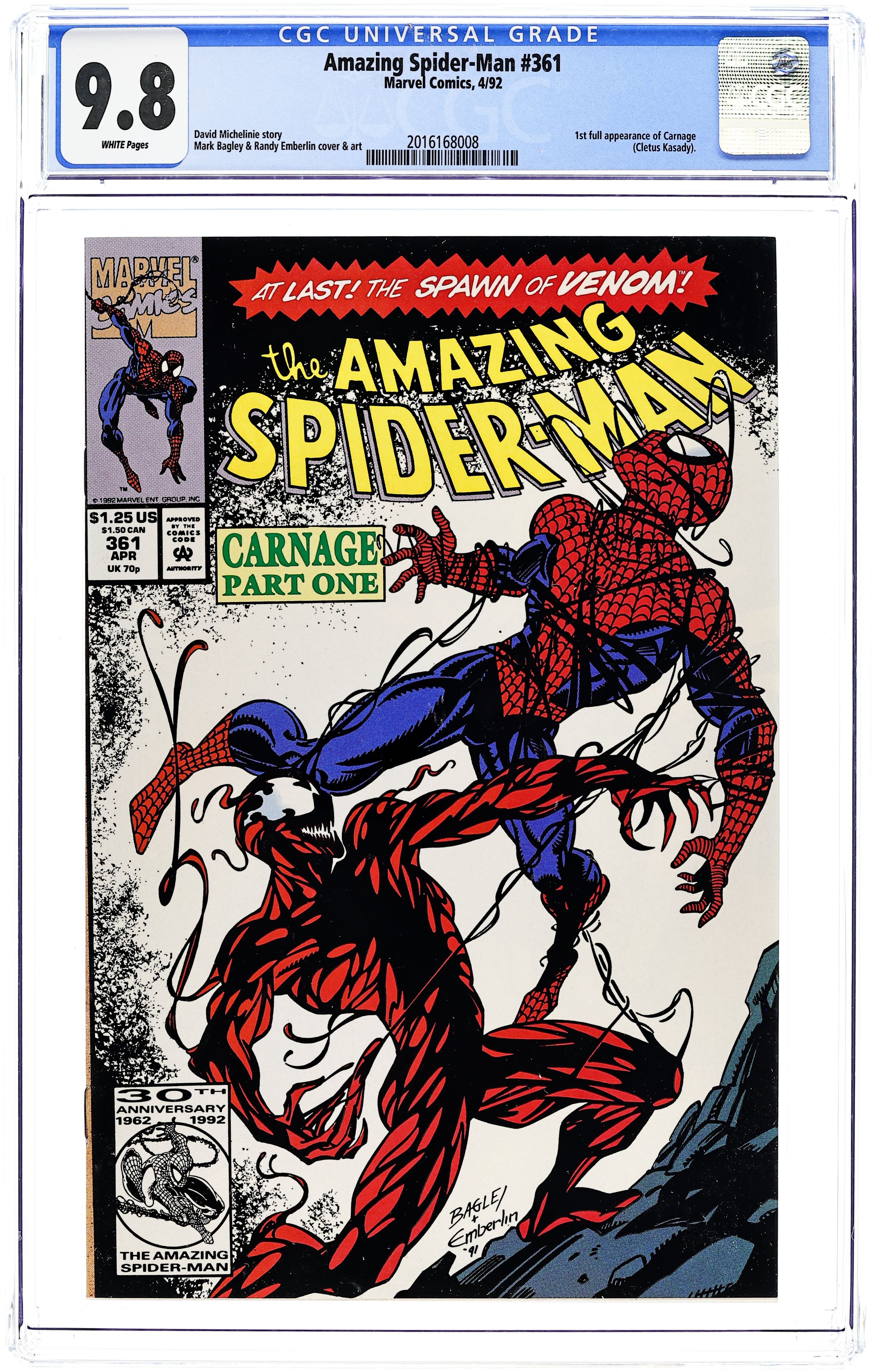 Ends Mar 9 7:18 PM CST Bid History 5 bids Current Bid $106 Your Secret Max Bid If you'd like to bid, please log in or register. First Printing. Direct Edition. First (full) appearance of Carnage in "Savage Genesis!" Part 1 of 3. Script by David Michelinie. Pencils by Mark Bagley. Inks by Randy Emberlin. Cover by Mark Bagley and Randy Emberlin. Blood runs in the streets as a serial killer roams New York City! And as the web-slinger investigates the murders, he notices a very disturbing similarity to another killer's modus operandi! In a burned-out building in Brooklyn, the spectacular one comes face-to-face with his new homicidal foe...Carnage! Can the wall-crawler end Cletus Kasady's rampage in their very first encounter? Cameo appearances by Aunt May and Mary Jane Watson. Flashback cameo by Venom. (Note: This three-part story was reprinted in 2011 in the trade paperback: Spider-Man -- The Vengeance of Venom.) 36 pages, full color. $1.25 cover price. NOTE: Most of these were distributed with slight printer tears in the bottom edge of the cover. Cover price $1.25.