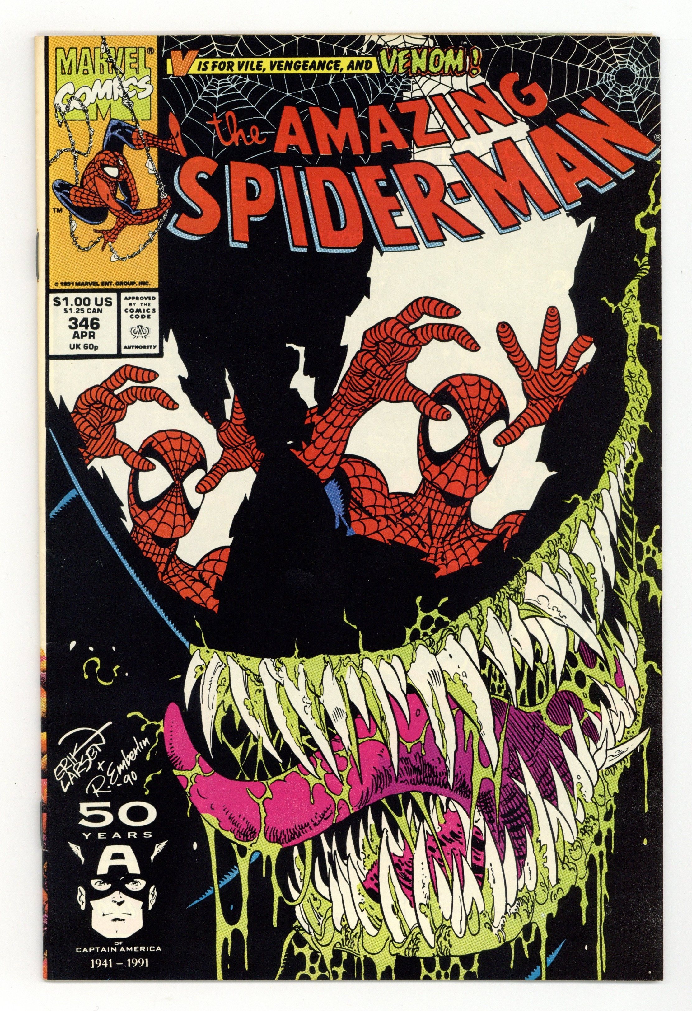Starts Apr 27 Direct Edition. Cover pencils by Erik Larsen, inks by Randy Emberlin. "Elliptical Pursuit!", script by David Michelinie, pencils by Erik Larsen, inks by Randy Emberlin; Eddie Brock is back…for Peters head!; After escaping prison, Venom taunts Spider-Man into a final showdown; Peter Parkers known for his smarts--why then does he stumble straight into Venoms trap?; An all-out smack down slugfest ensues. 36 pgs., full color. Cover price $1.00.