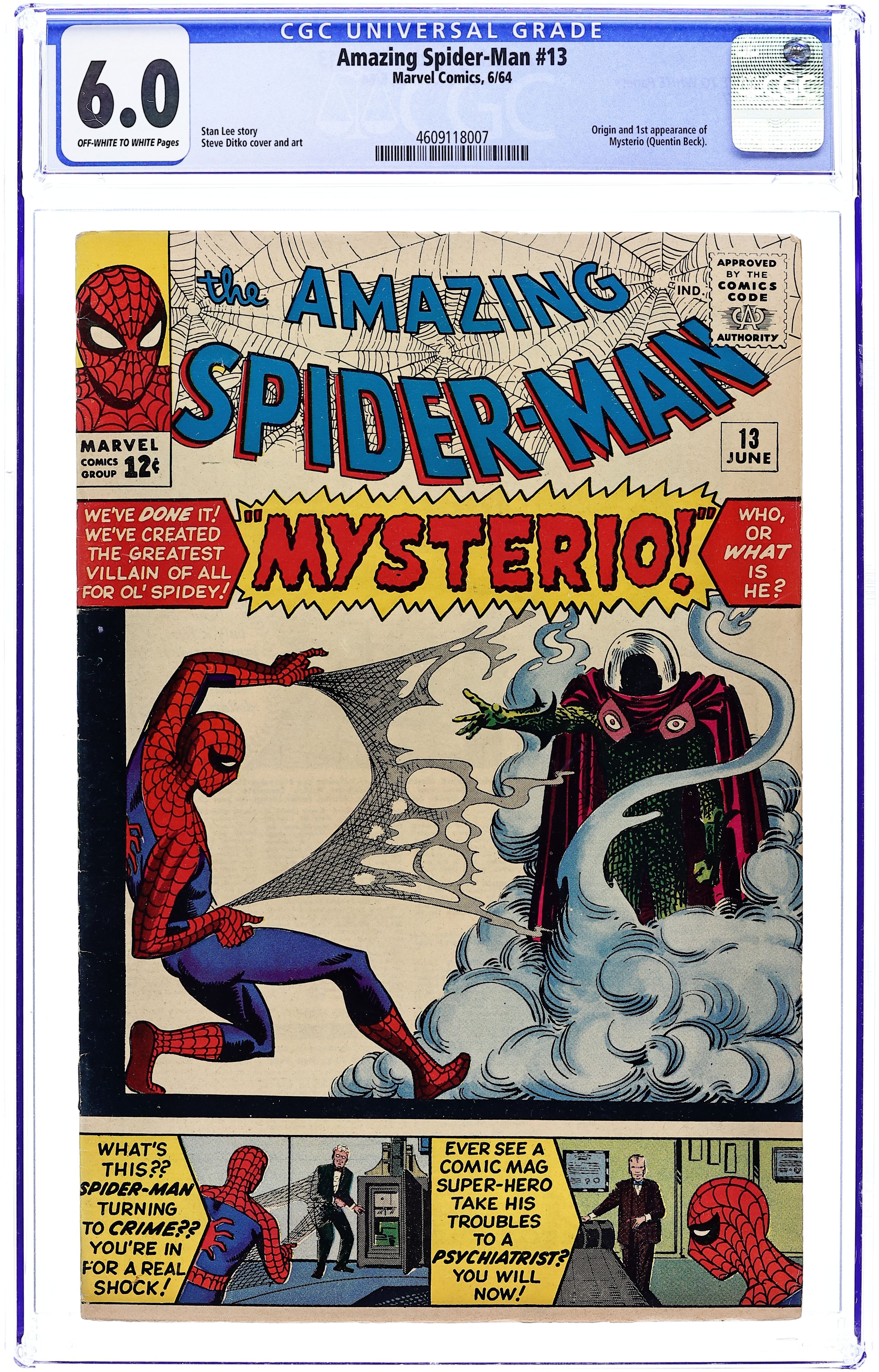 Spider-Man goes to see a psychiatrist! But it's really Mysterio messing with Spidey's mind in "Spider-Man Goes Mad." Script by Stan Lee, art and cover by Steve Ditko. Cameos (actually part of Spider-Man's imagination) by Doctor Octopus, the Vulture, and the Sandman. Reprinted in Marvel Tales # 19 and 162. Letters to the editor from comics writer Don McGregor and mycomicshop.com president Buddy Saunders! 36 pgs. Cover price $0.12.