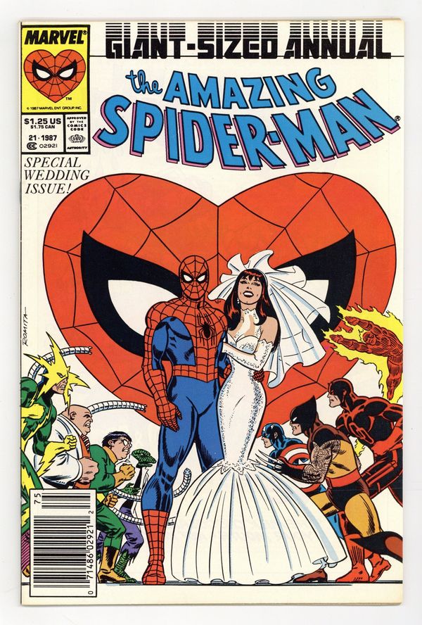 Starts Feb 2 Newsstand Edition. The marriage of Peter Parker and Mary Jane Watson in "The Wedding." Plot by Jim Shooter. Script by David Michelinie. Pencils by Paul Ryan. Inks by Vince Colletta. Cover by John Romita Sr. Newsstand Edition. At long last wedding bells ring for Peter Parker and Mary Jane Watson! What an exciting day! The blushing bride will need something old, something new, something borrowed, and something blue! While the Amazing Spider-Man will need to take care of two things before the big day! First, the easy task...short circuit Electro's latest scheme! And second, the tough one...put the memory and heartache of Gwen Stacy in the past forever. Will another trip to the Brooklyn Bridge bring peace to the wondrous wall-crawler? Or will the ghosts of days gone by derail a bright future with Mary Jane? Carpe diem, web-slinger! Appearances by Flash Thompson, Harry Osborn, Liz Osborn, Betty Leeds, Aunt May, Anna Watson, Joe Robertson, J. Jonah Jameson, and Willi Smith. Flashback cameos by the Green Goblin, Gwen Stacy, and Uncle Ben. (Notes: Peter and Mary Jane go on their honeymoon in Spectacular Spider-Man Annual 7. The Direct Edition cover features Peter Parker's friends and family. The Newsstand Edition depicts Spider-Man's friends and foes. Amazing Spider-Man Annual 21 was one of the first issues Marvel published with two different covers. This story was reprinted in the 1991 trade paperback: the Amazing Spider-Man - The Wedding.) 52 pages. Cover price $1.25.