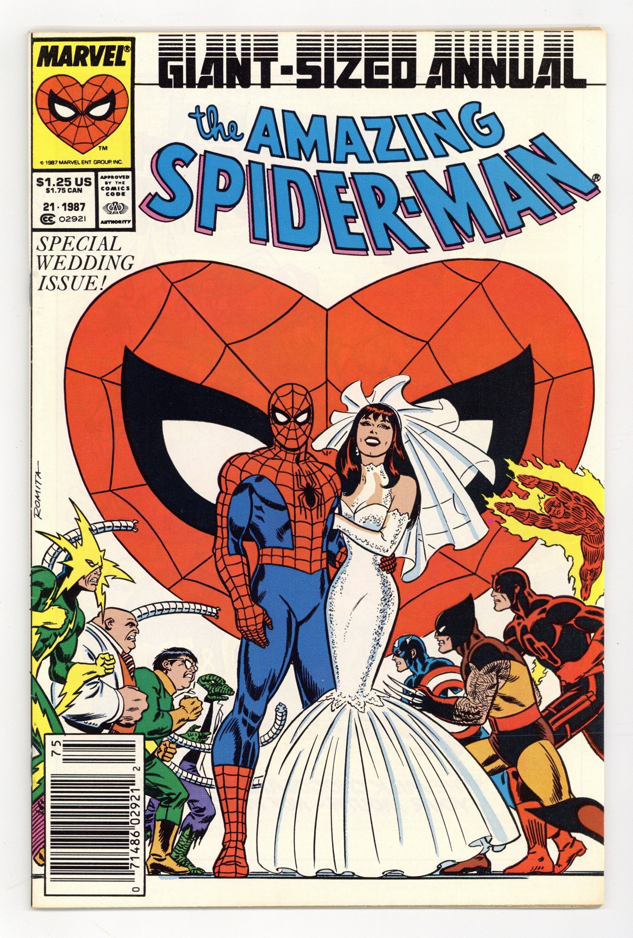 Starts Jan 19 Newsstand Edition. The marriage of Peter Parker and Mary Jane Watson in "The Wedding." Plot by Jim Shooter. Script by David Michelinie. Pencils by Paul Ryan. Inks by Vince Colletta. Cover by John Romita Sr. Newsstand Edition. At long last wedding bells ring for Peter Parker and Mary Jane Watson! What an exciting day! The blushing bride will need something old, something new, something borrowed, and something blue! While the Amazing Spider-Man will need to take care of two things before the big day! First, the easy task...short circuit Electro's latest scheme! And second, the tough one...put the memory and heartache of Gwen Stacy in the past forever. Will another trip to the Brooklyn Bridge bring peace to the wondrous wall-crawler? Or will the ghosts of days gone by derail a bright future with Mary Jane? Carpe diem, web-slinger! Appearances by Flash Thompson, Harry Osborn, Liz Osborn, Betty Leeds, Aunt May, Anna Watson, Joe Robertson, J. Jonah Jameson, and Willi Smith. Flashback cameos by the Green Goblin, Gwen Stacy, and Uncle Ben. (Notes: Peter and Mary Jane go on their honeymoon in Spectacular Spider-Man Annual 7. The Direct Edition cover features Peter Parker's friends and family. The Newsstand Edition depicts Spider-Man's friends and foes. Amazing Spider-Man Annual 21 was one of the first issues Marvel published with two different covers. This story was reprinted in the 1991 trade paperback: the Amazing Spider-Man - The Wedding.) 52 pages. Cover price $1.25.