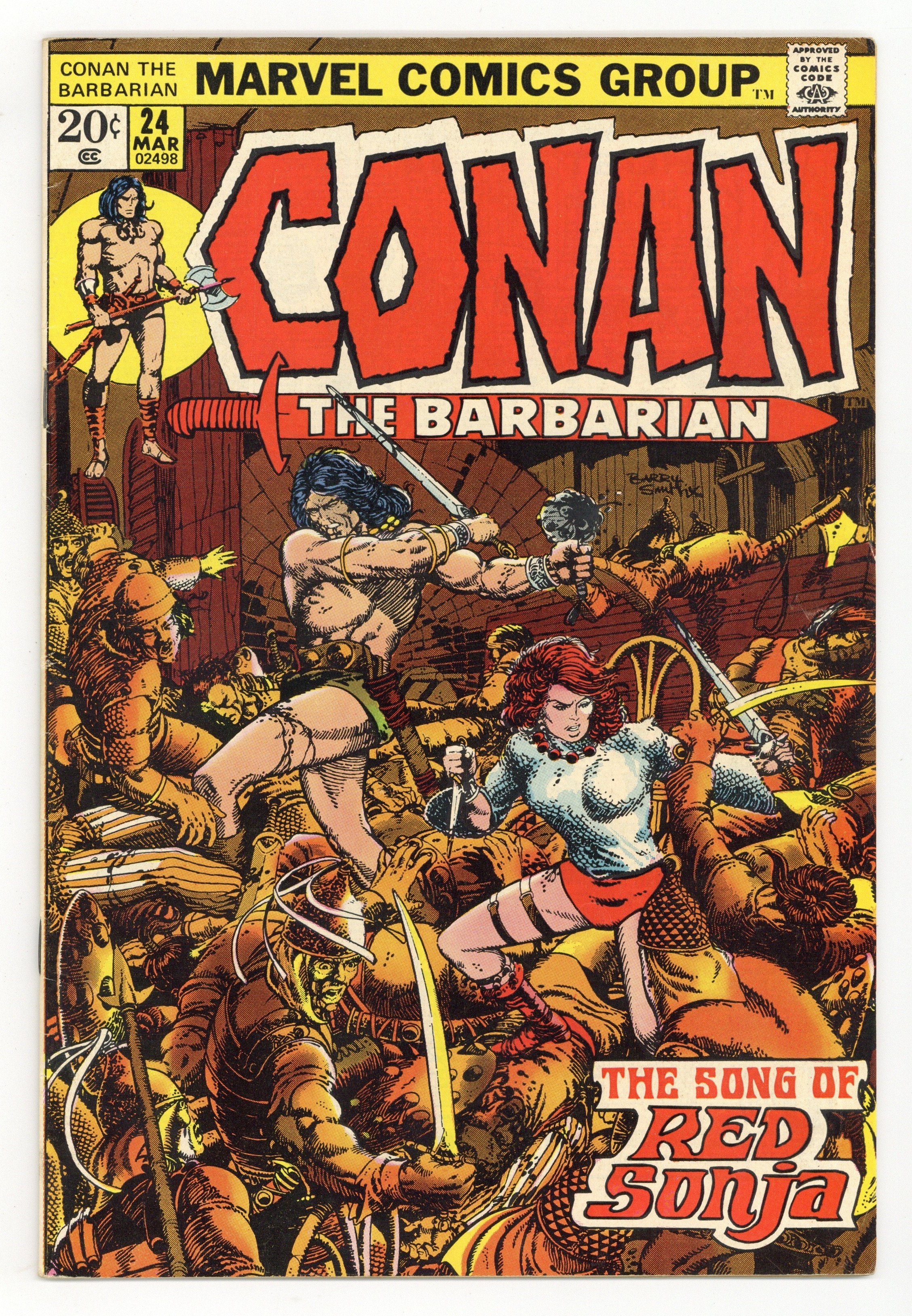 Starts Apr 20 Cover art by Barry Windsor-Smith. First full Red Sonja story, The Song of Red Sonja, script by Roy Thomas, pencils by Barry Windsor-Smith; setting: Makkalet; Conan and Red Sonja start a bar-fight, bathe in a fountain, scale temple walls, break in and steal a snake-tiara, and fight a magical snake; at the end Sonja tricks Conan, and leaves for Pah-Disha; the Red Sonja story continues in Savage Sword of Conan 1. Final Windsor-Smith art on this title. The art in this issue (at least on page 8, and perhaps elsewhere) was altered without Windsor-Smith's approval. See Marvel Treasury Edition 15 or Savage Sword of Conan 82 for the original version. (The reprint in Conan Saga 8 contains the altered version). In the letter's column, Roy Thomas responds and announces Barry Smith's final departure as Conan the Barbarian artist; Incidentally, Roy's responses to R. Benitz and Keith Taylor are mistakenly transposed. 36 pgs. Cover price $0.20. Cover price $0.20.
