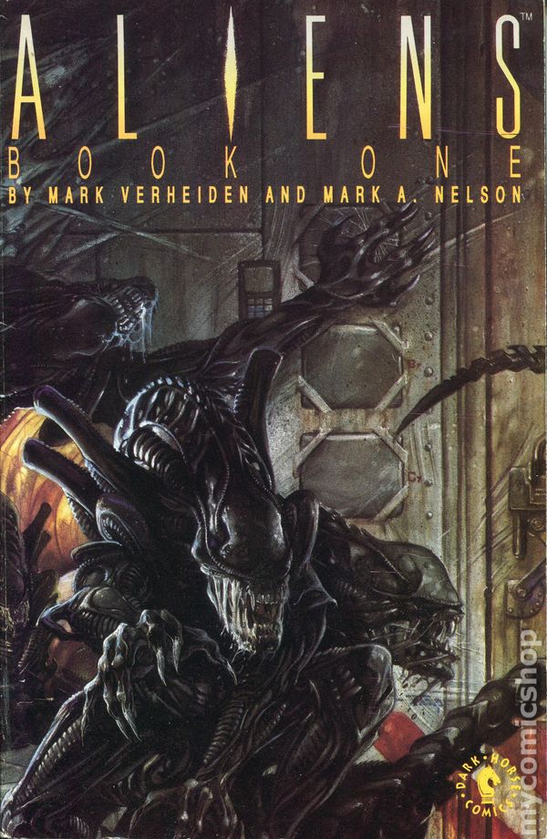 2nd Edition - Volume 1 - 1st printing. "Book One!" Collects Aliens (1988-1989) #1-6. Written by Mark Verheiden. Art by Mark A. Nelson. The collection includes all six issues of the Aliens series plus the short story from Dark Horse Presents #24 by Mark Verheiden & Mark A. Nelson. Also included are all of Nelson's frightening frontpieces form all printings of the series. Softcover, 168 pages, B&W. Cover price $11.95.