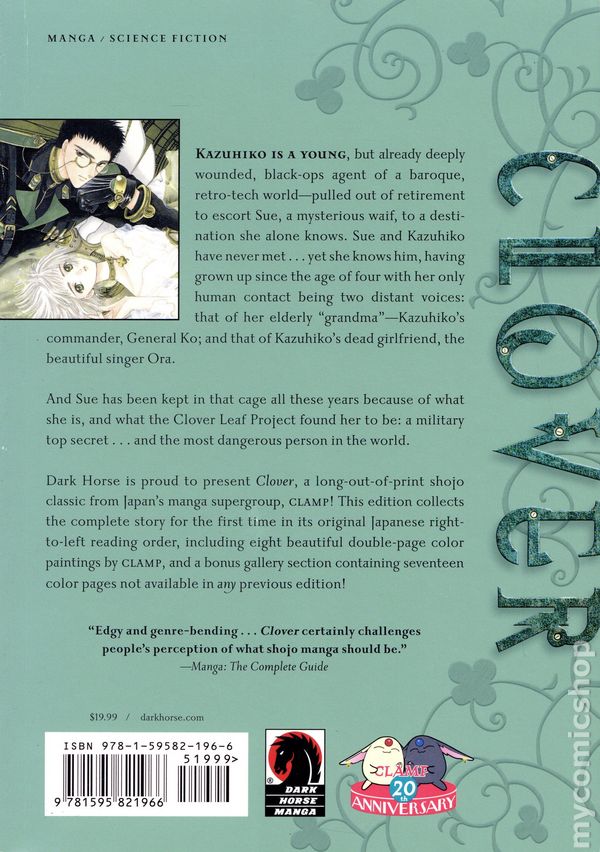 2nd and later printings. Story and Art by CLAMP. Kazuhiko is a young, but already deeply wounded black ops agent of a baroque, retro-tech future-pulled out of retirement to escort Sue, a mysterious waif, to a destination she alone knows. Sue and Kazuhiko have never met . . . yet she knows him, having grown up since the age of four with her only human contact two distant voices: that of her elderly 'grandma,' General Ko, and of Kazuhiko's dead girlfriend, Ora. And Sue has been kept in that cage all these years because of what she is, and what the Clover Leaf Project found her to be-a military top secret, and the most dangerous person in the world. o Clover is a long-out-of-print classic from Japan's shojo artist supergroup CLAMP! o Never before available in its original Japanese right-to-left reading orientation, Dark Horse not only brings Clover into English for the first time, but also collects all four of the original volumes into one reasonably priced omnibus, with a brand-new cover design especially for this edition! Softcover, 5 3/4-in. x 8 1/4-in., 512 pages, b/w. Cover price $19.95.