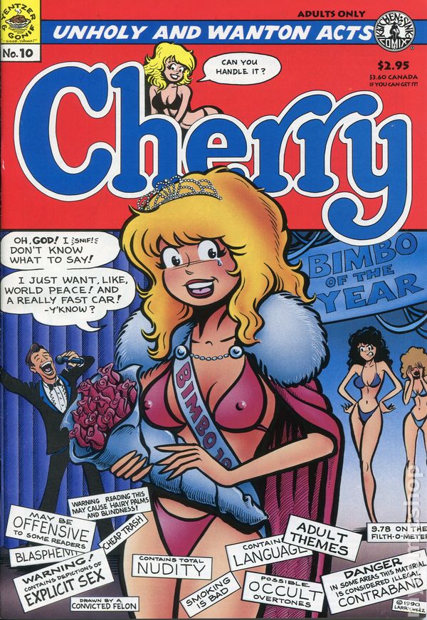 1st Printing. 1993. 1st issue published by Kitchen Sink. 10th Anniversary Issue. Origin of Cherry. Front and back cover art by Larry Welz. Larry Welz, Larry Todd, Reed Waller, Chuck Austen, Dan Fogel, Sharon Welz, and Mike Johnson stories and art. Parodies of Bill & Ted and Terminator. 6 3/4" x 10 1/4", b&w, 44 pages. Adults Only. Cover price $2.95.