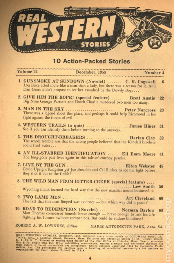 Dec 1958. Western Stories: Norman Barlow "Road to Redemption", Peter Norcross "Man in the Sky", C. H. Cogswell, Brett Austin, James Hines, Harlan Clay, Ell Emm Moore, Elton Webster, Lew Smith, and Art Cleveland. 6 5/8" x 9 1/4"; black and white; 98 newsprint pages. Cover price $0.25.