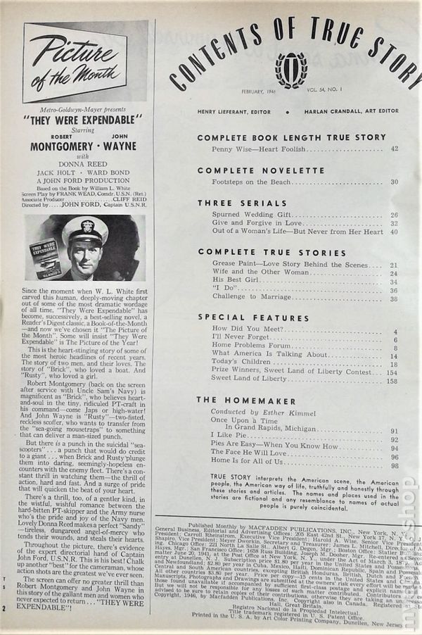 Mar. 1946. True stories with a romantic theme illustrated with period photographs. Also includes jokes, articles and advice. 8 1/2-in. x 11 1/2-in., 166 pages, B&W. Cover price $0.15.