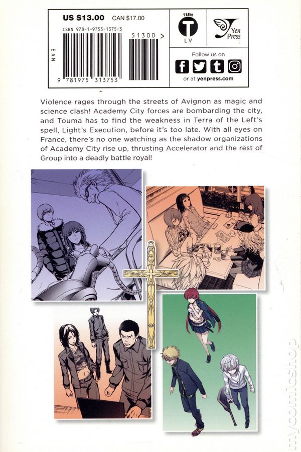 Violence rages through the streets of Avignon as magic and science clash! Academy City forces are bombarding the city, and Touma has to find the weakness in Terra of the Left's spell, Light's Execution, before it's too late. With all eyes on France, there's no one watching as the shadow organizations of Academy City rise up, thrusting Accelerator and the rest of Group into a deadly battle royal!