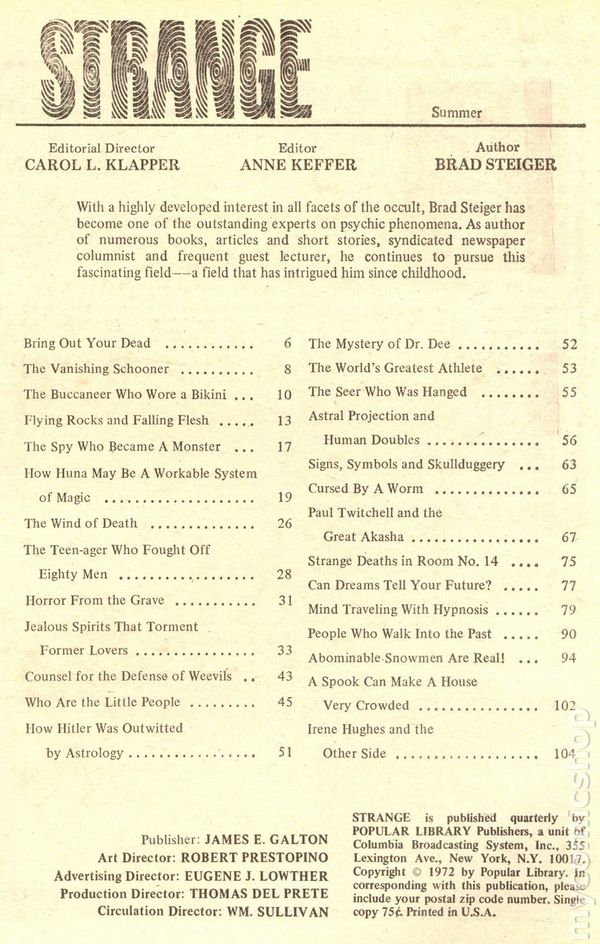 Issue #2 - Summer 1971. Written by Brad Steiger. True stories of the supernatural. 6 1/2-in. x 9 1/4-in., 130 pages, text. Cover price $0.75.