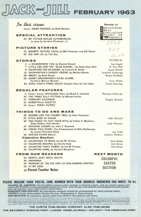 Cover by Margot Austin. Stories by Helen Burns, Margaret Hamilton, Rose Ross, Ann King, Louise Stinetorf, Dorothy Tooker, Hilda Watkins, Marian Richardson, Walter Pierce, Antonia Potemkina, Sadie Garnett, Elizabeth Hewitt, Alice Alison Lide, and A. Carter Anderson. Art by Mel Fahrner, Beth Krush, Jania Miller, Ursula Koering, Neal Janzen, Janet Smalley, Joe Krush, Rebecca Shapiro, Anne Wilcox, Elizabeth Sumner, Margaret Landes and Iris Beatty Johnson. A long-running magazine of fiction, fact and comics for children. Mollie dreams she goes to the animal hospital, where her dog is her doctor. The toys get left outside and go on an adventure while no one is looking. Ice Age twins Ik and Gik have an adventure on an island far from their tribal home. Winter Games Outdoors; The Prince Who First-Footed; Mollie's Dream; Catch That Possum!; Inky's Drawing Lesson; Jeanie in Florida; Nonsense Verses; Two Legends from Other Lands; Dot Puzzle; Things to Make; Puzzle Jingles; Home for the Holidays; Brother and Sister; Riddles; Naughty Katinka; Toys in the Sky; The Ice-Clan Twins; Boo Boo the Woods Boy; Doctor Monkey Earns a Title; Finnie; the Office Goldfish. 7-in. x 10-in., 68 pages, Full Color. Cover price $0.25.