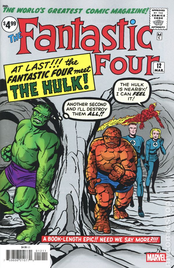 Foil Cover. (W) Stan Lee (A) Jack Kirby (CA) Jack Kirby Continuing a facsimile collection of the foundational adventures of Marvel's First Family! And the early days of the FF were never more eventful than their fateful first encounter with the Incredible Hulk! General "Thunderbolt" Ross wants the help of the fabulous foursome in his relentless vendetta against the rampaging Hulk, and Reed Richards' updated Fantasticar might help them find their target! A rivalry for the ages is about to form between the Thing and the Hulk, but can Dr. Bruce Banner help the FF identify the real danger? It's one of the all-time great Marvel comic books, boldly re-presented in its original form, ads and all! Reprinting FANTASTIC FOUR (1961) #12. Marvel is reprinting the first twelve issues of FANTASTIC FOUR as they originally appeared! 32 pages, not rated, full color Cover price $4.99.