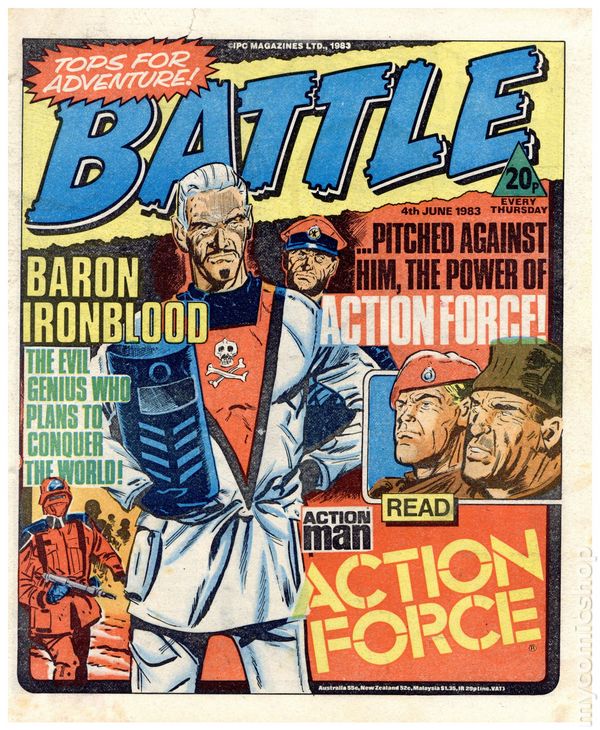 January 8, 1983. Published by IPC Magazines, Ltd. in the U.K. "Tough action war stories every week!" Combined with Valiant (also an IPC publication). 9 x 11 in.; black and white (color centerspread); 32 pages; 18p cover price.