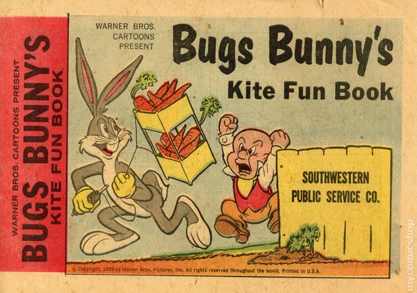 Bugs Bunny Kite Fun Book (1959) is a promotional comic distributed by Reddy Kilowatt, Inc. via investory-owned utility companies. Bugs Bunny, Elmer Fudd, Cicero Pig join Reddy Kilowatt in a story about kite safety and fun. The back cover features Reddy's Kite Safety Rules which are presented with an assist from Bugs Bunny. 16 pages, full color, newsprint, 5-in. x 7-in., no cover price.
