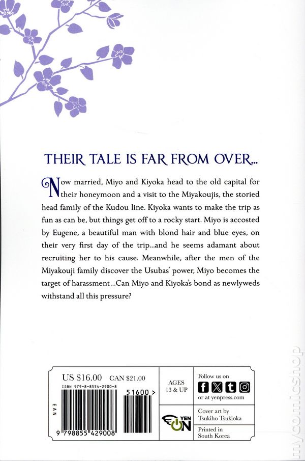 Volume 9 - 1st printing. Written by Akumi Agitogi. Art and cover by Tsukiho Tsukioka. Translated by David Musto. Now married, Miyo and Kiyoka head to the Old Capital for their honeymoon and to visit the Miyakoujis, the storied head family of the Kudou line. While Kiyoka wants to make the trip as fun as can be, things get off to a rocky start when Miyo is accosted by a beautiful man with blond hair and blue eyes by the name of Eugene on their very first day of the trip...and he seems adamant about recruiting Miyo to his cause. Meanwhile, after the men of the Miyakouji family learn of the power of the Usabas, Miyo becomes the target of harassment... But can Miyo and Kiyokas bond as newlyweds hold up under all this pressure? Softcover, 5-in. x 7-in., 176 pages, Text (with B&W Chapter Illustrations). Teen Cover price $16.00.
