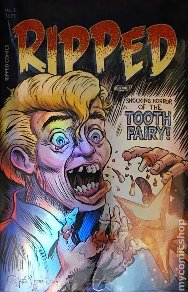 Foil Edition "A" Cover by Steve Ricketts. Written by Steve Ricketts. Art by Steve Ricketts. Coloring by Federico Pepto Sioc Jr. After failing to stop the "Whatever Bitches" in RIPPED #2, our hero trained, focused, and... leveled up his gas. In Ripped #3, he discovers he can fly thanks to his Unique digestive gift and meets the mysterious swamp sorceress, Trixie LaCroix-aka the Tooth Fairy, whos packing a magical wand the size of a canoe paddle. The world of Uniques just got weirder! 32pgs. FC Cover price $15.00.