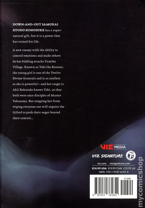 Volume 9 - 1st printing. Story and art by Daruma Matsuura. Translated by Caleb Cook. A new enemy with the ability to control emotions and make others do her bidding attacks Yumiko Village. Known as Toki the Rooster, the young girl is one of the Twelve Divine Generals and is as soulless as she is powerful—and her target is Aki! Bokutake knows Toki, as they both were once disciples of Master Takayama. But stopping her from wiping everyone out will require the Gifted to push their anger beyond their control… Softcover, 5-in. x 7-in., 176 pages, B&W. Teen+ Cover price $14.99.
