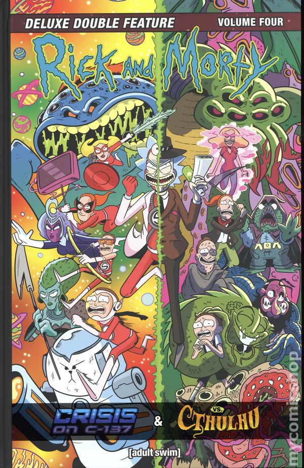 Volume 4 - 1st printing. "Crisis on C-137 and Rick and Morty vs. Cthulhu!" Collects Rick and Morty Crisis on C 137 (2022 Oni Press) #1-4 and Rick and Morty vs. Cthulhu (2022 Oni Press) #1-4. Written by Stephanie Phillips and Jim Zub. Art and Cover by Ryan Lee and Troy Little. Cover by Marc Ellerby. The hit comic book series based on the hilarious [adult swim] animated show Rick and Morty continues in a beautifully oversized deluxe hardcover collection presenting all-new stories not seen on TV! When the universe's great defenders, the Vindicators, are all but eradicated Rick Sanchez and the Smith family pull together the remaining ragtag superheroes to respond to a familiar band of enemies in Crisis on C-137. And just when you thought Cthulhu was all played out in the pop-culture ecosystem, Rick and Morty enter the Lovecraft dimension in Rick and Morty vs. Cthulhu! Hardcover, 7-in. x 12-in., 224 pages, full color. Mature Readers Cover price $59.99.