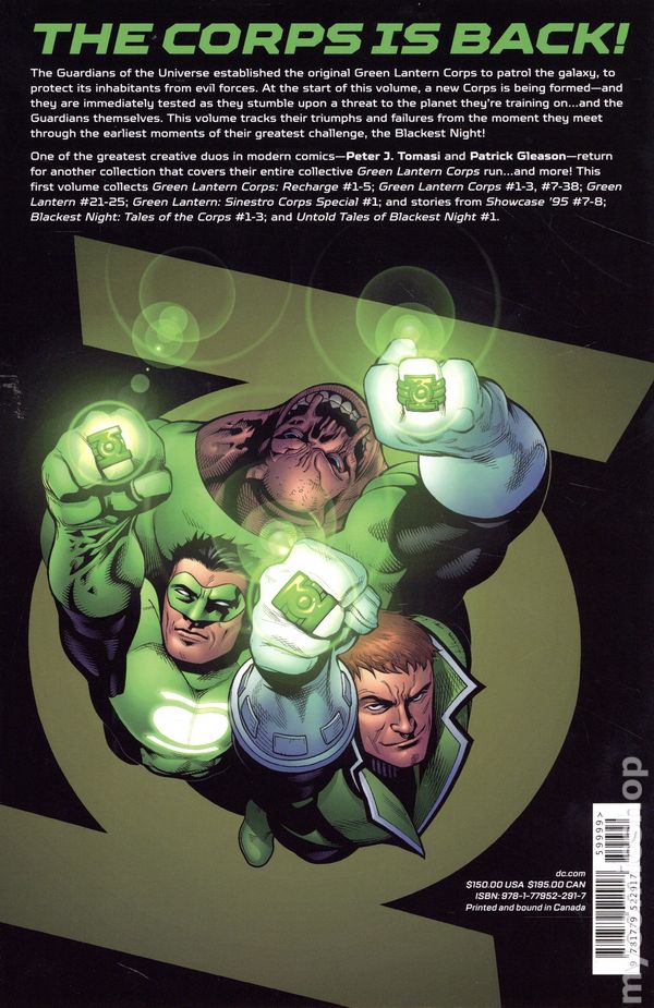 Volume 1 - 2nd and later printings. Collects Green Lantern Corps: Recharge (2005) #1-5; Green Lantern Corps (2006-2011 1st Series DC) #1-3 and 7-38; Green Lantern (2005-2011 4th Series DC) #21-25; Green Lantern Sinestro Corps Special (2007); and stories from Showcase 95 (1995) #7-8, Blackest Night: Tales of the Corps (2009) #1-3, and Untold Tales of Blackest Night (2010 DC). Written by Geoff Johns, Dave Gibbons, Keith Champagne, Peter J. Tomasi, and Sterling Gates. Art by Patrick Gleason, Pascal Alixe, Scot Eaton, Jamal Igle, Carlos Magno, Tom Mandrake, Mike Mayhew Nelson, Dustin Nguyen, Tom Nguyen, Ivan Reis, Luke Ross, Chris Samnee, Angel Unzueta, Ethan Van Sciver, Prentis Rollins, Christian Alamy, Rebecca Buchman, Oclair Albert, Marlo Alquiza, Vicente Cifuentes, Dan Davis, Pam Eklund, Wayne Faucher, Julio Ferreira, Derek Fridolfs, Drew Geraci, Mike Gray, Sandra Hope, Rob Hunter, Fabio Laguna, Jerry Ordway, Rodney Ramos, and Ray Snyder. Cover by Patrick Gleason and Prentis Rollins. Back cover by Patrick Gleason and Christian Alamy. One of the greatest creative duos in modern comics—Peter J. Tomasi and Patrick Gleason—returns for another collection that covers their entire collective Green Lantern Corps run...and more! Hardcover, 8 1/2-in. x 11-in., 1,240 pages, full color. Cover price $150.00.