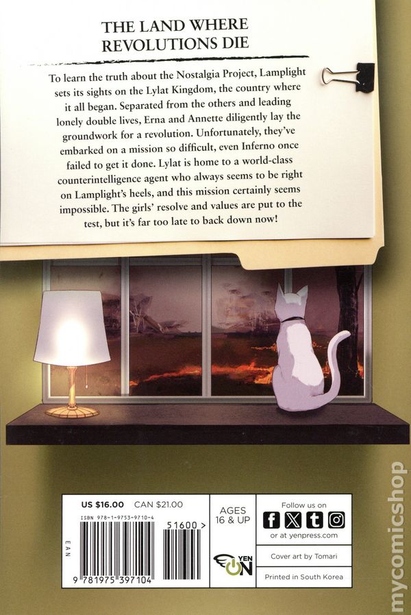 Volume 10 - 1st printing. "The High Plain of Sara!" Written by Takemachi. Art and cover by Tomari. Translated by Nathaniel Thrasher. To learn the truth about the Nostalgia Project, Lamplight sets their sights on the Lylat Kingdom, the country where it all began. Separated from the others and living a lonely double life, Erna and Annette diligently lay the groundwork for a revolution. Unfortunately, theyve embarked on a mission so difficult, even the Inferno twins once failed to get it done. Lylat is known as the land where revolutions die, and that title is thanks to a world-class counterintelligence agent. The girls resolve and values are put to the test. Its far too late to back down now! Softcover, 5-in. x 7-in., 216 pagers, Text (with B&W Chapter Illustrations). Mature Readers Cover price $16.00.