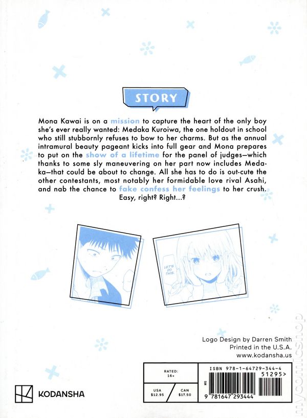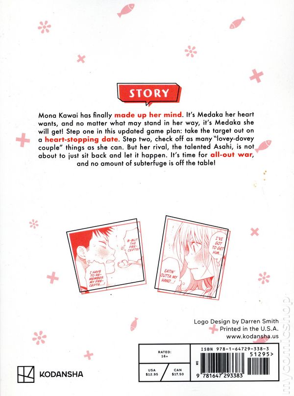 Volume 2 - 1st printing. Story and art by Ran Kuze. Translated by Nicole Frasik. Mona is the cutest girl in school, and she knows it. In fact, she's worked hard to make her high school debut successful. But no matter what she does, she can't seem to catch the eye of stone-cold stoic Medaka Kuroiwa-but she's not about to give up that easy. Medaka, on the other hand, has been raised at a temple as a monk and was told to never become close to women. Who will win in this heated battle of wills? Softcover, 5-in. x 7-in., 162 pages, B&W. Older Teen (16+) Cover price $12.95.